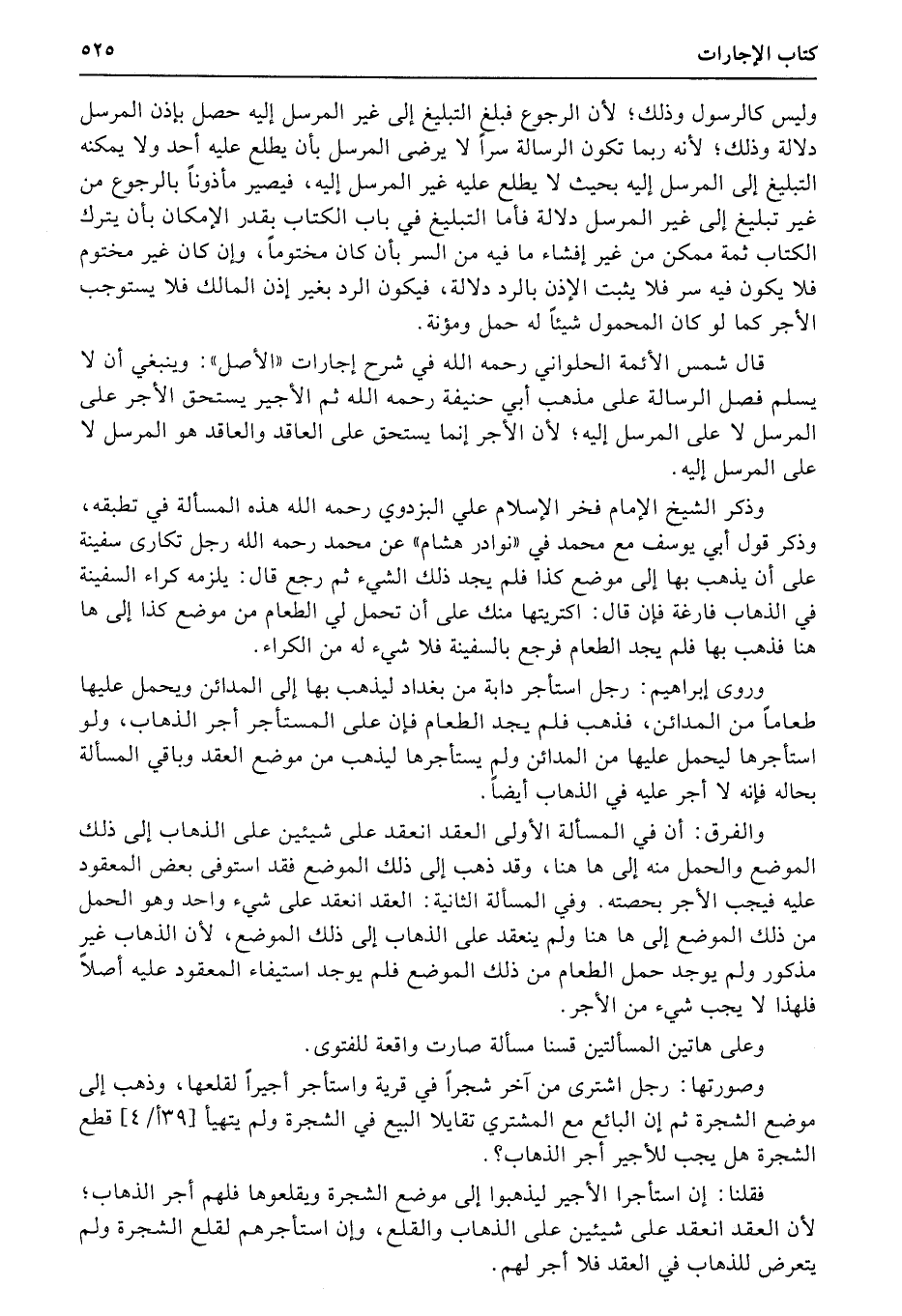 وذكر الشيخ الإمام فخر الإسلام علي البزودي رحمه الله هذه المسألة في تطبقه، وذكر قول أبي يوسف مع محمد في «نوادر هشام» عن محمد رحمه الله رجل تكارى سفينة على أن يذهب بها إلى موضع كذا فلم يجد ذلك الشيء ثم رجع قال: يلزمه كراء السفينة في الذهاب فارغة فإن قال: اكتريتها منك على أن تحمل لي الطعام من موضع كذا إلى ها هنا فذهب بها فلم يجد الطعام فرجع بالسفينة فلا شيء له من الكراء.