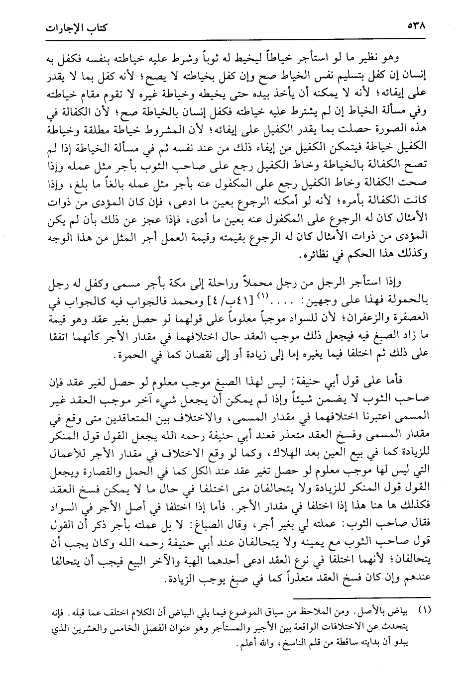 وإذا استأجر الرجل من رجل محملاً وراحلة إلى مكة بأجر مسمى وكفل له رجل بالحمولة فهذا على وجهين:.... (41ب4) ومحمد فالجواب فيه كالجواب في العصفرة والزعفران؛ لأن للسواد موجباً معلوماً على قولهما لو حصل بغير عقد وهو قيمة ما زاد الصبغ فيه فيجعل ذلك موجب العقد حال اختلافهما في مقدار الأجر كأنهما اتفقا على ذلك ثم اختلفا فيما يغيره إما إلى زيادة أو إلى نقصان كما في الحمرة.