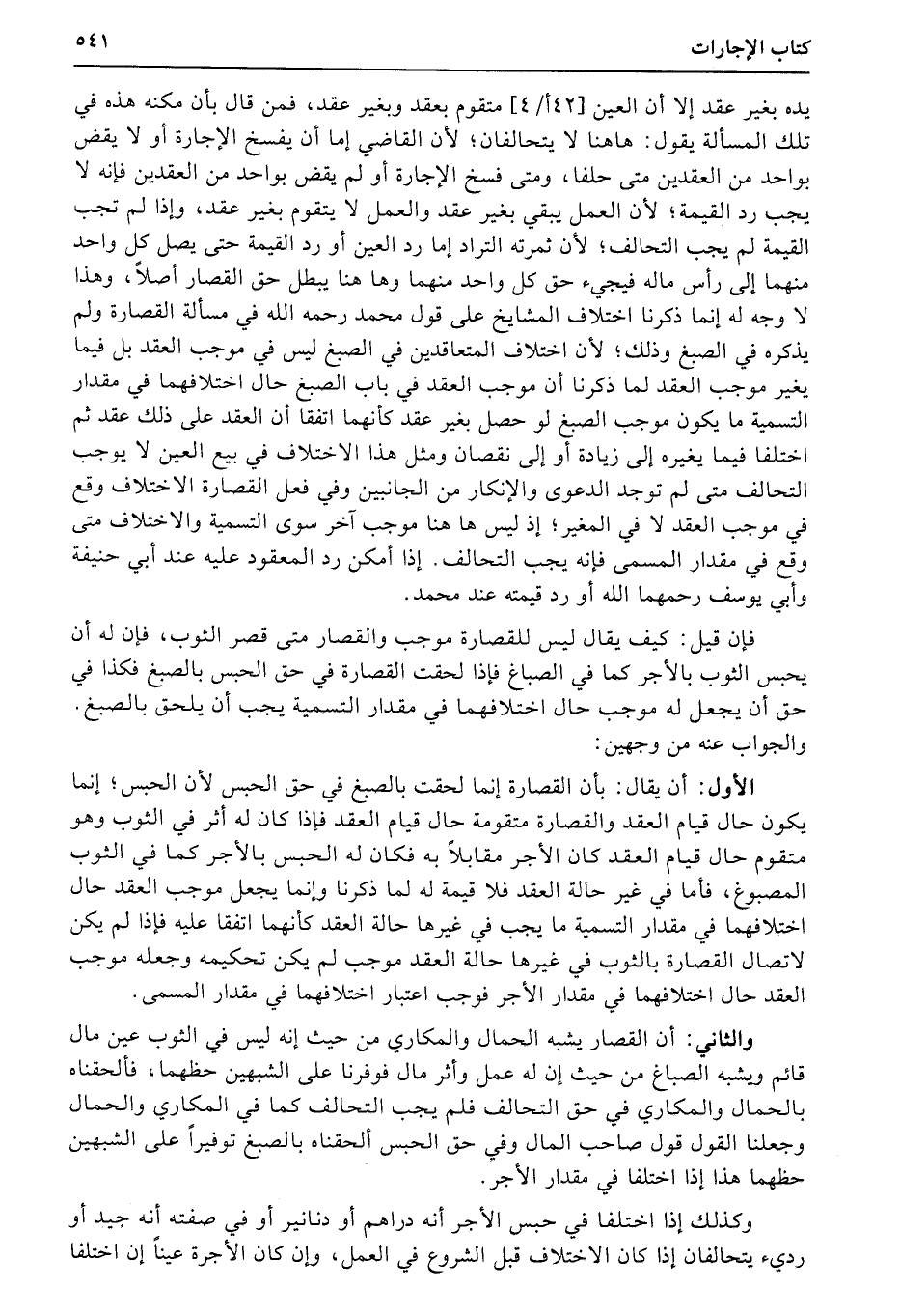 الأولى: أن يقال: بأن القصارة إنما لحقت بالصبغ في حق الحبس لأن الحبس؛ إنما يكون حال قيام العقد والقصارة متقومة حال قيام العقد فإذا كان له أثر في الثوب وهو متقوم حال قيام العقد كان الأجر مقابلاً به فكان له الحبس بالأجر كما في الثوب المصبوغ، فأما في غير حالة العقد فلا قيمة له لما ذكرنا وإنما يجعل موجب العقد حال اختلافهما في مقدار التسمية ما يجب في غيرها حالة العقد كأنهما اتفقا عليه فإذا لم يكن لاتصال القصارة بالثوب في غيرها حالة العقد موجب لم يكن تحكيمه وجعله موجب العقد حال اختلافهما في مقدار الأجر فوجب اعتبار اختلافهما في مقدار المسمى.