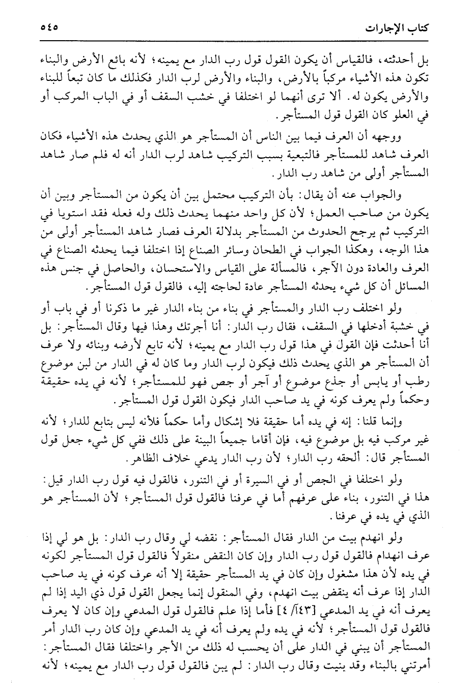 ولو اختلف رب الدار والمستأجر في بناء من بناء الدار غير ما ذكرنا أو في باب أو في خشبة أدخلها في السقف، فقال رب الدار: أنا أجرتك وهذا فيها وقال المستأجر: بل أنا أحدثت فإن القول في هذا قول رب الدار مع يمينه؛ لأنه تابع لأرضه وبنائه ولا عرف أن المستأجر هو الذي يحدث ذلك فيكون لرب الدار وما كان له في الدار من لبن موضوع رطب أو يابس أو جذع موضوع أو آجر أو جص فهو للمستأجر؛ لأنه في يده حقيقة وحكماً ولم يعرف كونه في يد صاحب الدار فيكون القول قول المستأجر.