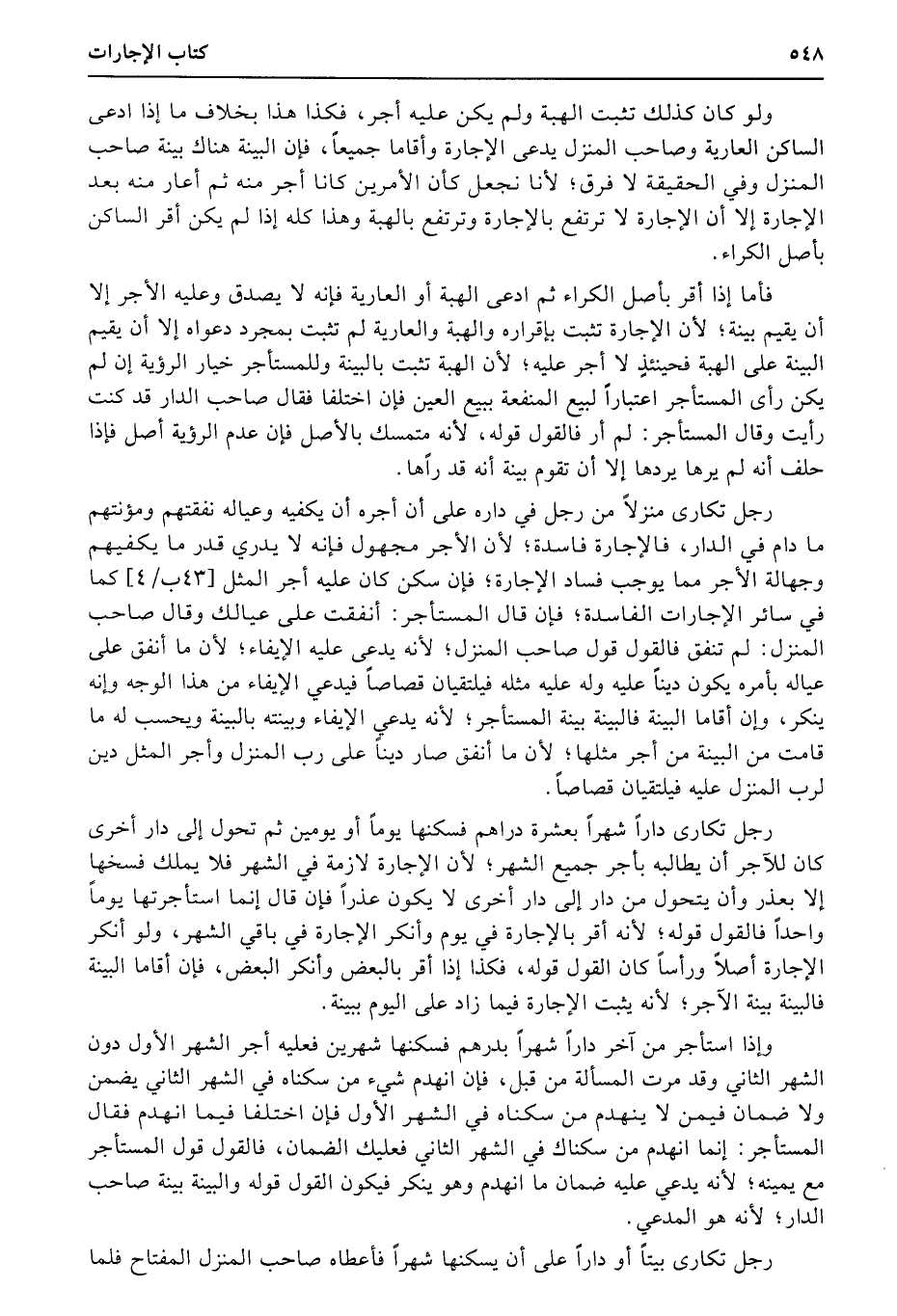 فأما إذا أقر بأصل الكراء ثم ادعى الهبة أو العارية فإنه لا يصدق وعليه الأجر إلا أن يقيم بينة؛ لأن الإجارة تثبت بإقراره والهبة والعارية لم تثبت بمجرد دعواه إلا أن يقيم البينة على الهبة فحينئذٍ لا أجر عليه؛ لأن الهبة تثبت بالبينة وللمستأجر خيار الرؤية إن لم يكن رأى المستأجر اعتباراً لبيع المنفعة ببيع العين فإن اختلفا فقال صاحب الدار قد كنت رأيت وقال المستأجر: لم أر فالقول قوله، لأنه متمسك بالأصل فإن عدم الرؤية أصل فإذا حلف أنه لم يرها يردها إلا أن تقوم بينة أنه قد راًها.