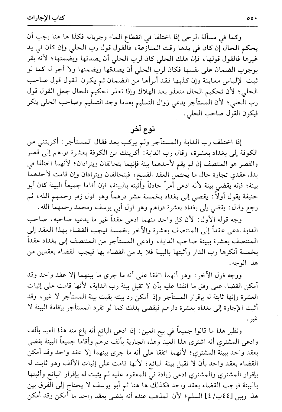 إذا اختلف رب الدابة والمستأجر ولم يركب بعد فقال المستأجر: أكريتني من الكوفة إلى بغداد بعشرة، وقال رب الدابة: أكريتك من الكوفة بعشرة دراهم إلى قصر والقصر هو المنتصف إن لم يقم لأحدهما بينة فإنهما يتحالفان ويترادان؛ لأنهما اختلفا في بدل عقدي تجارة حال ما يحتمل العقد الفسخ، فيتحالفان ويترادان وإن قامت لأحدهما بينة؛ فإنه يقضي بينة لأنه ادعى أمراً حادثاً وأثبته بالبينة، فإن أقاما جميعاً البينة كان أبو حنيفة يقول أولاً: يقضي إلى بغداد بخمسة عشر درهماً وهو قول زفر رحمهم الله، ثم رجع وقال: يقضي إلى بغداد بعشرة دراهم وهو قول أبي يوسف ومحمد رحمهما الله.