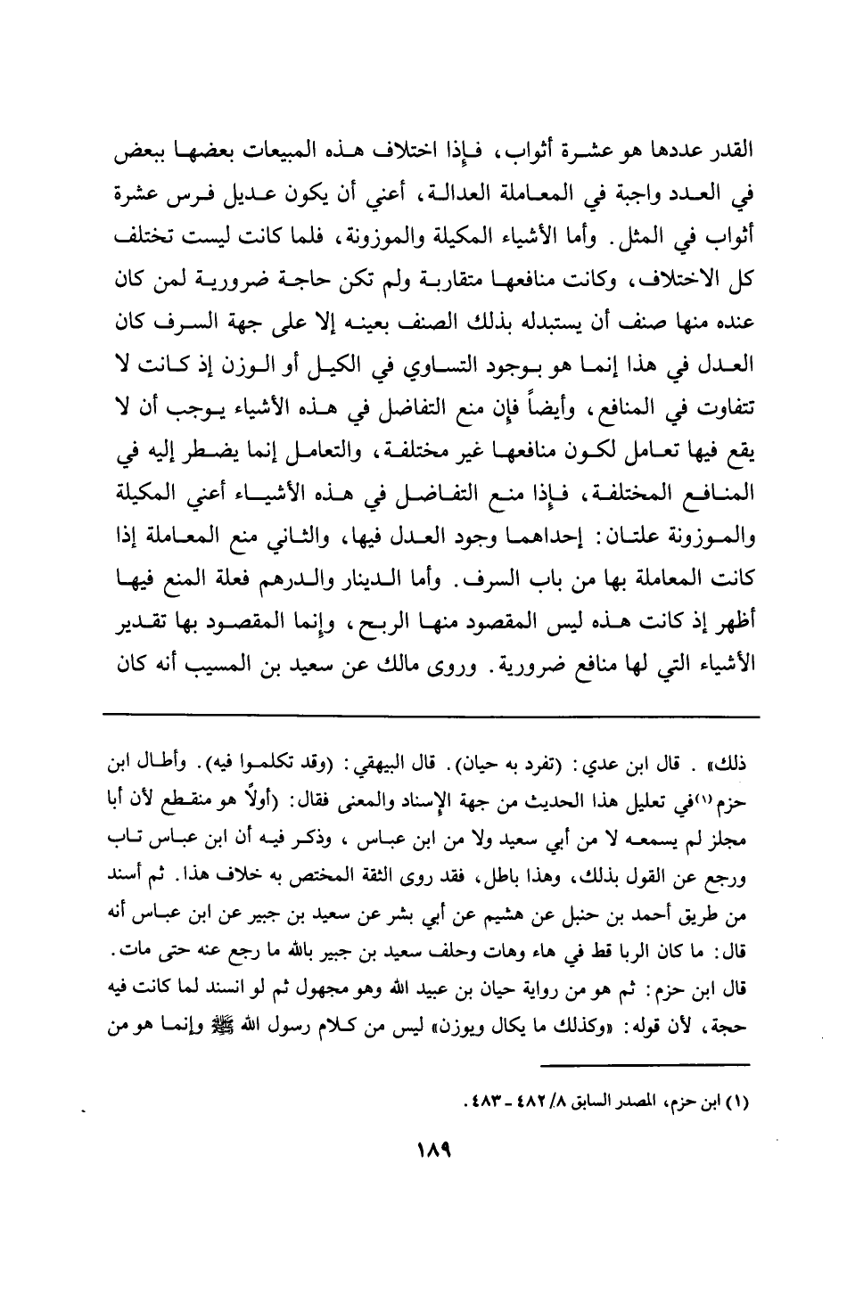 ذلك". قال ابن عدي: (تفرد به حيان). قال البيهقي: (وقد تكلموا فيه). وأطال ابن حزم في تعليل هذا الحديث من جهة الإسناد والمعنى فقال: (أولًا هو منقطع لأن أبا مجلز لم يسمعه لا من أبي سعيد ولا من ابن عباس، وذكر فيه أن ابن عباس تاب ورجع عن القول بذلك، وهذا باطل، فقد روى الثقة المختص به خلاف هذا. ثم أسند من طريق أحمد بن حنبل عن هشيم عن أبي بشر عن سعيد بن جبير عن ابن عباس أنه قال: ما كان الربا قط في هاء وهات وحلف سعيد بن جبير بالله ما رجع عنه حتى مات. قال ابن حزم: ثم هو من رواية حيان بن عبيد الله وهو مجهول ثم لو انسند لما كانت فيه حجة، لأن قوله: "وكذلك ما يكال ويوزن" ليس من كلام رسول الله - صلى الله عليه وسلم - وإنما هو من