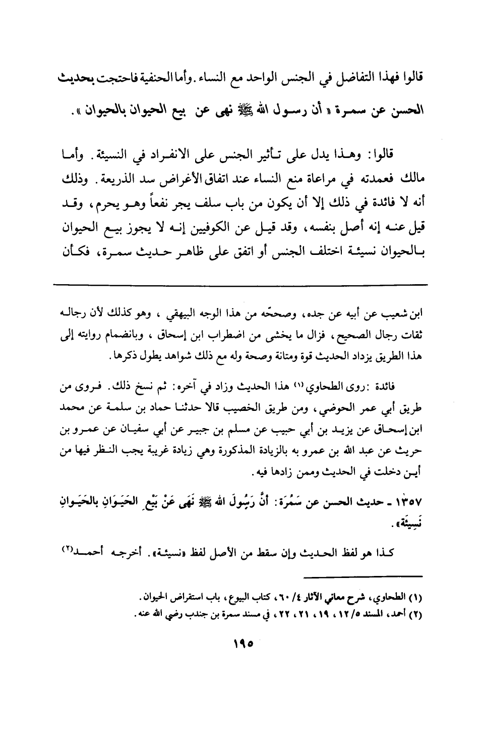 1357 - حديث الحسن عن سَمُرَة: أنَّ رَسُولَ الله - صلى الله عليه وسلم - نَهَى عَنْ بَيْعِ الحَيَوَانِ بالحَيَوانِ نَسِيئَة".