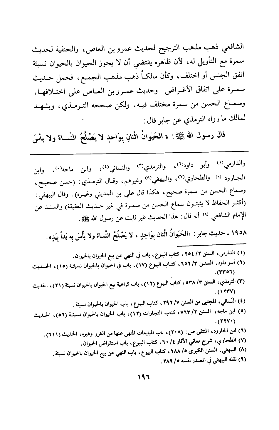 1958 - حديث جابر: "الحَيَوانُ اثْنان بِوَاحِدٍ، لا يَصْلُحُ النَّساءُ ولا بأْسَ بِهِ يَدًا بِيَدٍ".