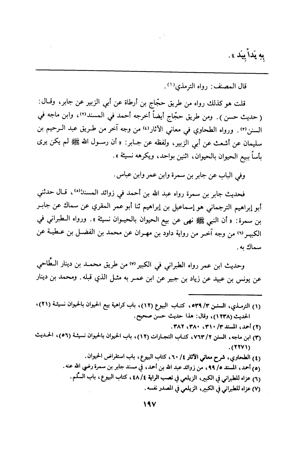 قلت هو كذلك رواه من طريق حجّاج بن أرطاة عن أبي الزبير عن جابر، وقال: (حديث حسن). ومن طريق حجّاج أيضًا أخرجه أحمد في المسند، وابن ماجه في السنن. ورواه الطحاوي في معاني الآثار من وجه آخر من طريق عبد الرحيم بن سليمان عن أشعث عن أبي الزبير، ولفظه عن جابر: "أن رسول الله - صلى الله عليه وسلم - لم يكن يرى بأسًا ببيع الحيوان بالحيوان، اثنين بواحد، ويكرهه نسيئة".