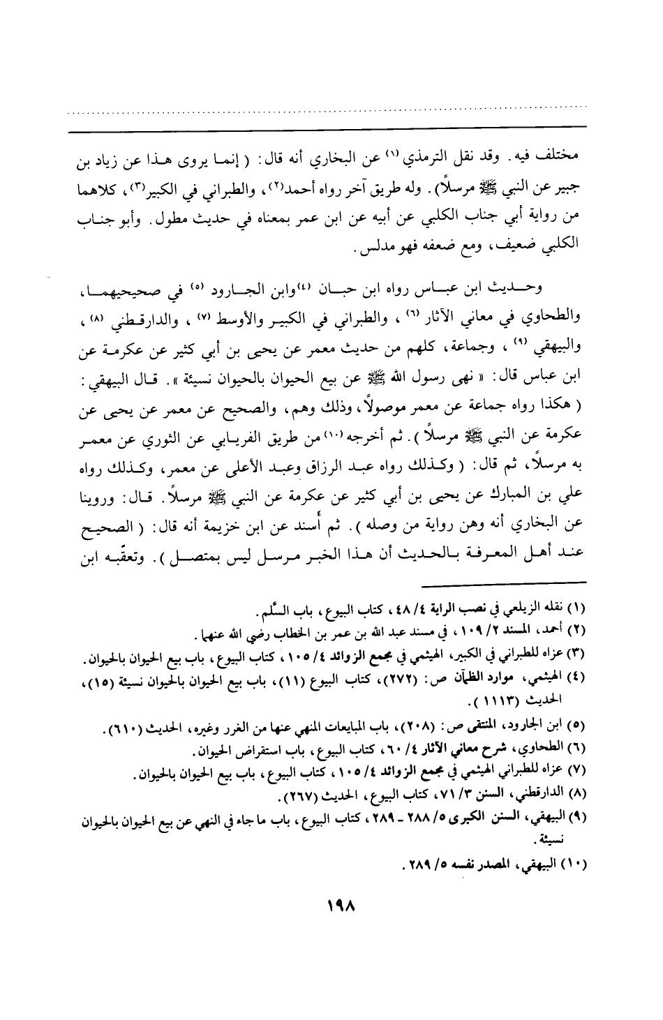 وحديث ابن عباس رواه ابن حبان وابن الجارود في صحيحيهما، والطحاوي في معاني الآثار، والطبراني في الكبير والأوسط، والدارقطني، والبيهقي، وجماعة، كلهم من حديث معمر عن يحيى بن أبي كثير عن عكرمة عن ابن عباس قال: "نهى رسول الله - صلى الله عليه وسلم - عن بيع الحيوان بالحيوان نسيئة". قال البيهقي: (هكذا رواه جماعة عن معمر موصولًا، وذلك وهم، والصحيح عن معمر عن يحيى عن عكرمة عن النبي - صلى الله عليه وسلم - مرسلًا). ثم أخرجه من طريق الفريابي عن الثوري عن معمر به مرسلًا، ثم قال: (وكذلك رواه عبد الرزاق وعبد الأعلى عن معمر، وكذلك رواه علي بن المبارك عن يحيى بن أبي كثير عن عكرمة عن النبي - صلى الله عليه وسلم - مرسلًا. قال: وروينا عن البخاري أنه وهن رواية من وصله). ثم أسند عن ابن خزيمة أنه قال: (الصحيح عند أهل المعرفة بالحديث أن هذا الخبر مرسل ليس بمتصل). وتعقّبه ابن
