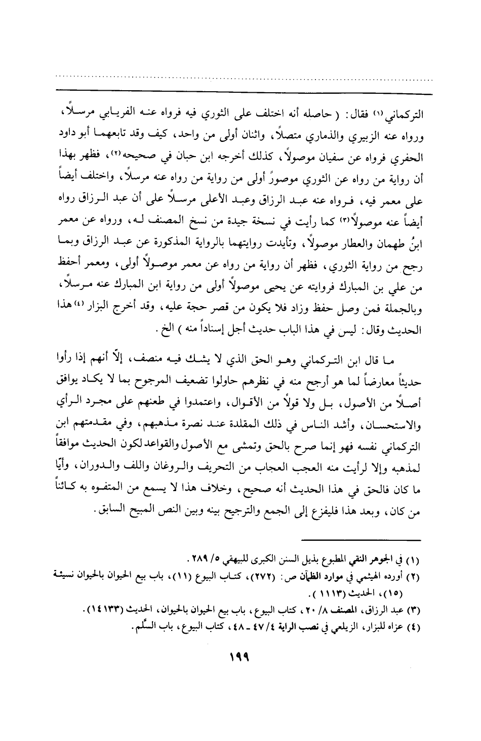 التركماني فقال: (حاصله أنه اختلف على الثوري فيه فرواه عنه الفريابي مرسلًا، ورواه عنه الزبيري والذماري متصلًا، واثنان أولى من واحد، كيف وقد تابعهما أبو داود الحفري فرواه عن سفيان موصولًا، كذلك أخرجه ابن حبان في صحيحه، فظهر بهذا أن رواية من رواه عن الثوري موصولًا أولى من رواية من رواه عنه مرسلًا، واختلف أيضًا على معمر فيه، فرواه عنه عبد الرزاق وعبد الأعلى مرسلًا على أن عبد الرزاق رواه أيضًا عنه موصولًا كما رأيت في نسخة جيدة من نسخ المصنف له، ورواه عن معمر ابنُ طهمان والعطار موصولًا، وتأيدت روايتهما بالرواية المذكورة عن عبد الرزاق وبما رجح من رواية الثوري، فظهر أن رواية من رواه عن معمر موصولًا أولى، ومعمر أحفظ من علي بن المبارك فروايته عن يحيى موصولًا أولى من رواية ابن المبارك عنه مرسلًا، وبالجملة فمن وصل حفظ وزاد فلا يكون من قصر حجة عليه، وقد أخرج البزار هذا الحديث وقال: ليس في هذا الباب حديث أجل إسنادًا منه) الخ.