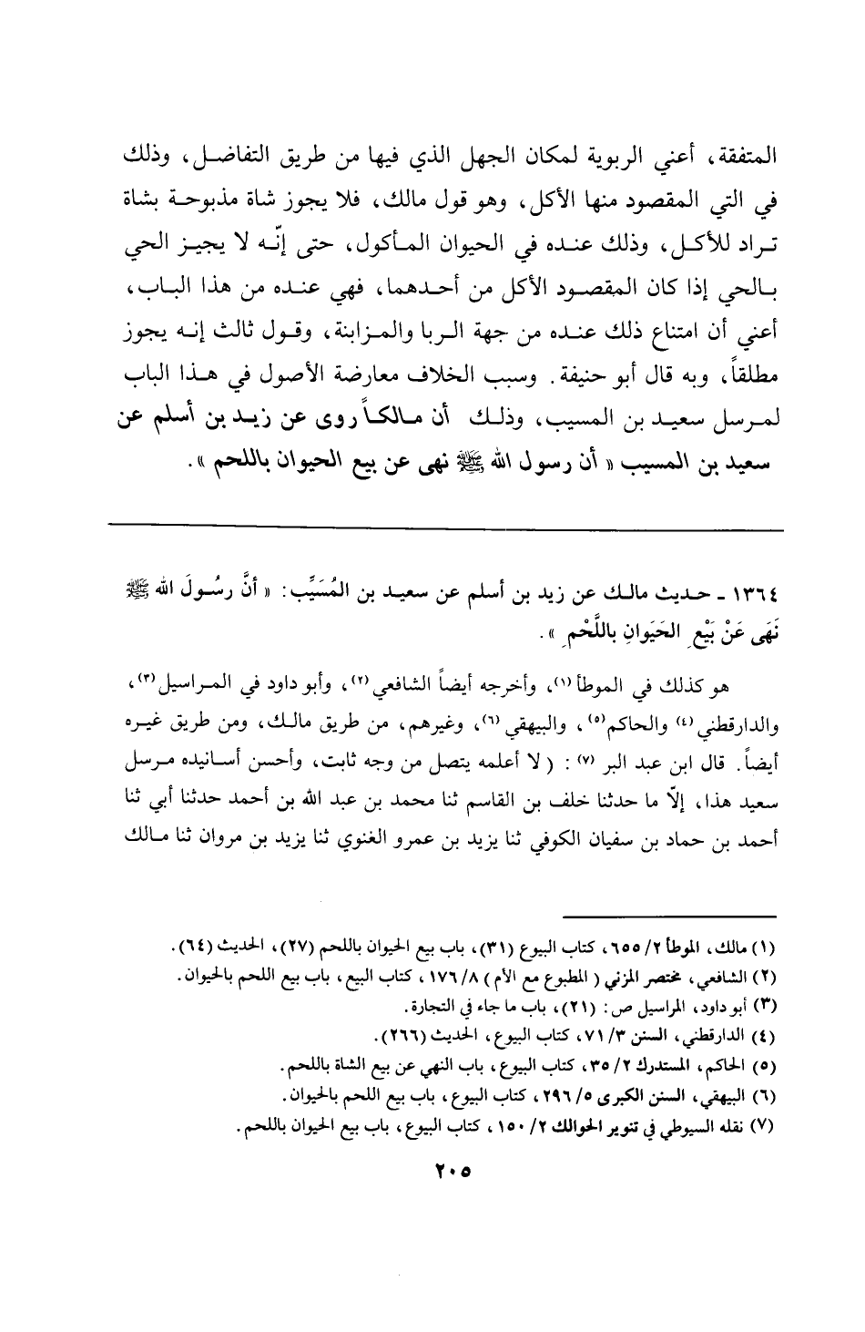 1364 - حديث مالك عن زيد بن أسلم عن سعيد بن المُسَيِّب: "أنَّ رسُولَ الله - صلى الله عليه وسلم - نَهَى عَنْ بيْعِ الحَيَوانِ باللَّحْمِ".