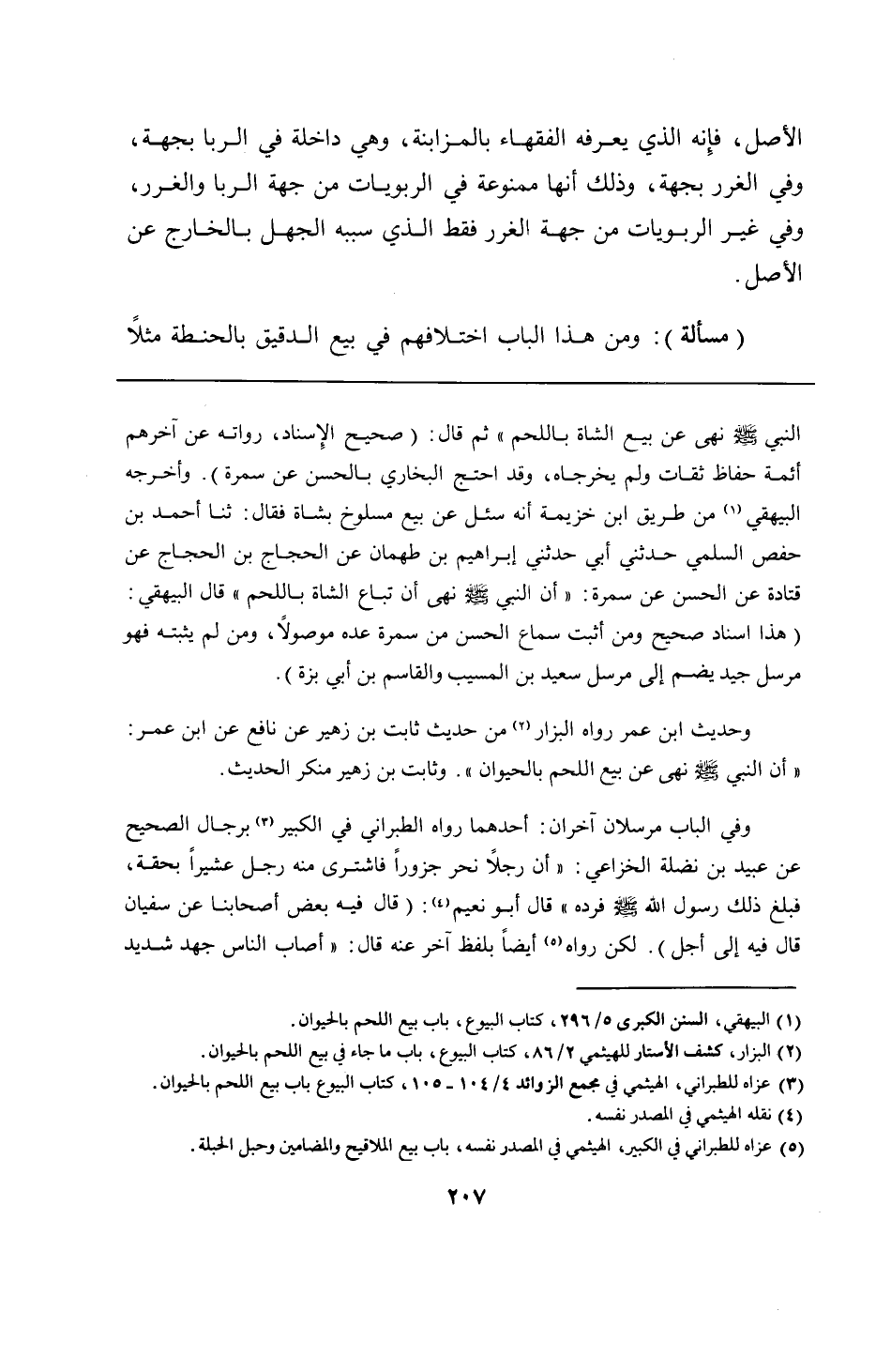 النبي - صلى الله عليه وسلم - نهى عن بيع الشاة باللحم" ثم قال: (صحيح الإسناد، رواته عن آخرهم أئمة حفاظ ثقات ولم يخرجاه، وقد احتج البخاري بالحسن عن سمرة). وأخرجه البيهقي من طريق ابن خزيمة أنه سئل عن بيع مسلوخ بشاة فقال: ثنا أحمد بن حفص السلمي حدثني أبي حدثني إبراهيم بن طهمان عن الحجاج بن الحجاج عن قتادة عن الحسن عن سمرة: "أن النبي - صلى الله عليه وسلم - نهى أن تباع الشاة باللحم" قال البيهقي: (هذا إسناد صحيح ومن أثبت سماع الحسن من سمرة عده موصولًا، ومن لم يثبته فهو مرسل جيد يضم إلى مرسل سعيد بن المسيب والقاسم بن أبي بزة).