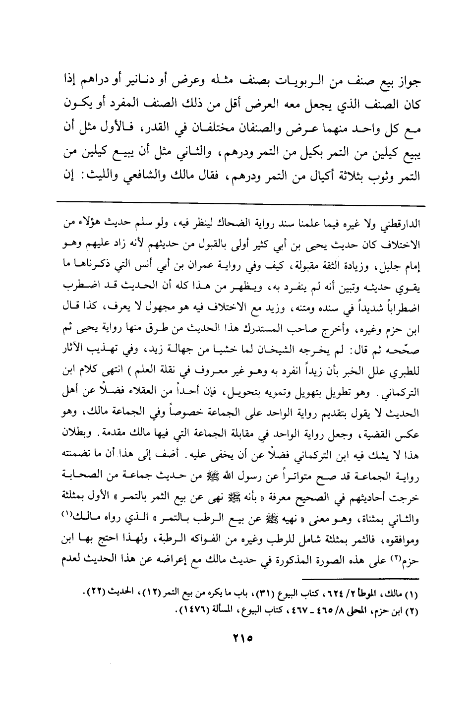 الدارقطني ولا غيره فيما علمنا سند رواية الضحاك لينظر فيه، ولو سلم حديث هؤلاء من الاختلاف كان حديث يحيى بن أبي كثير أولى بالقبول من حديثهم لأنه زاد عليهم وهو إمام جليل، وزيادة الثقة مقبولة، كيف وفي رواية عمران بن أبي أنس التي ذكرناها ما يقوي حديثه وتبين أنه لم ينفرد به، ويظهر من هذا كله أن الحديث قد اضطرب اضطرابًا شديدًا في سنده ومتنه، وزيد مع الاختلاف فيه هو مجهول لا يعرف، كذا قال ابن حزم وغيره، وأخرج صاحب المستدرك هذا الحديث من طرق منها رواية يحيى ثم صحّحه ثم قال: لم يخرجه الشيخان لما خشيا من جهالة زيد، وفي تهذيب الآثار للطبري علل الخبر بأن زيدًا انفرد به وهو غير معروف في نقلة العلم) انتهى كلام ابن التركماني. وهو تطويل بتهويل وتمويه بتحويل، فإن أحدًا من العقلاء فضلًا عن أهل الحديث لا يقول بتقديم رواية الواحد على الجماعة خصوصًا وفي الجماعة مالك، وهو عكس القضية، وجعل رواية الواحد في مقابلة الجماعة التي فيها مالك مقدمة. وبطلان هذا لا يشك فيه ابن التركماني فضلًا عن أن يخفى عليه. أضف إلى هذا أن ما تضمنته رواية الجماعة قد صح متواترًا عن رسول الله - صلى الله عليه وسلم - من حديث جماعة من الصحابة خرجت أحاديثهم في الصحيح معرفة "بأنه - صلى الله عليه وسلم - نهى عن بيع الثمر بالتمر" الأول بمثلثة والثاني بمثناة، وهو معنى "نهيه - صلى الله عليه وسلم - عن بيع الرطب بالتمر" الذي رواه مالك وموافقوه، فالثمر بمثلثة شامل للرطب وغيره من الفواكه الرطبة، ولهذا احتج بها ابن حزم على هذه الصورة المذكورة في حديث مالك مع إعراضه عن هذا الحديث لعدم