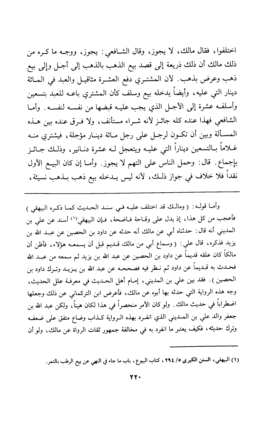 وأما قوله: (ومالك قد اختلف عليه في سند الحديث كما ذكره البيهقي) فأعجب من كل هذا، إذ يدل على وقاحة فاضحة، فإن البيهقي أسند عن علي بن المديني أنه قال: حدثناه أبي عن مالك أنه حدثه عن داود بن الحصين عن عبد الله بن يزيد فذكره، قال علي: (وسماع أبي من مالك قديم قبل أن يسمعه هؤلاء، فأظن أن مالكًا كان علقه قديمًا عن داود بن الحصين عن عبد الله بن يزيد ثم سمعه من عبد الله فحدث به قديمًا عن داود ثم نظر فيه فصححه عن عبد الله بن يزيد وترك داود بن الحصين). فقد بين علي بن المديني، إمام أهل الحديث في معرفة علل الحديث، وجه هذه الرواية التي حدثه بها أبوه عن مالك، فأعرض ابن التركماني عن ذلك وجعلها اضطرابًا في حديث مالك. ولو كان الأمر منحصرًا في هذا لكان هينًا، ولكن عبد الله بن جعفر والد علي بن المديني الذي انفرد بهذه الرواية كذاب وضاع متفق على ضعفه وترك حديثه، فكيف يعتبر ما انفرد به في مخالفة جمهور ثقات الرواة عن مالك، ولو أن
