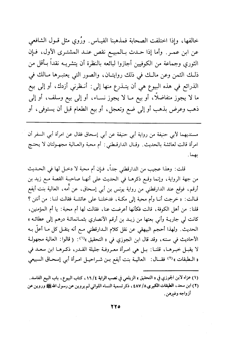 قلت: وهذا عجيب من الدارقطني جدًا، فإِن أم محبة لا دخل لها في الحديث من جهة الرواية، وإنما وقع ذكرها في الحديث على أنها صاحبة القصة مع زيد بن أرقم، فوقع عند الدارقطني من رواية يونس بن أبي إسحاق، عن أُمه، العالية بنت أيفع قالت: "خرجت أنا وأم محبة إلى مكة، فدخلنا على عائشة فقالت لنا: من أنتن؟ قلنا: من أهل الكوفة، قالت فكأنها أعرضت عنا، فقالت لها أم محبة: يا أم المؤمنين، كانت لي جارية وأني بعتها من زيد بن أرقم الأنصاري بثمانمائة درهم إلى عطائه" الحديث. ولهذا أحجم البيهقي عن نقل كلام الدارقطني مع أنه ينقل كل ما أعلّ به الأحاديث في سننه، وقد قال ابن الجوزي في "التحقيق": (قالوا: العالية مجهولة لا يقبل خبرها، قلنا: بل هي امرأة معروفة جليلة القدر، ذكرها ابن سعد في "الطبقات" فقال: العالية بنت أيفع بن شراحيل امرأة أبي إسحاق السبيعي