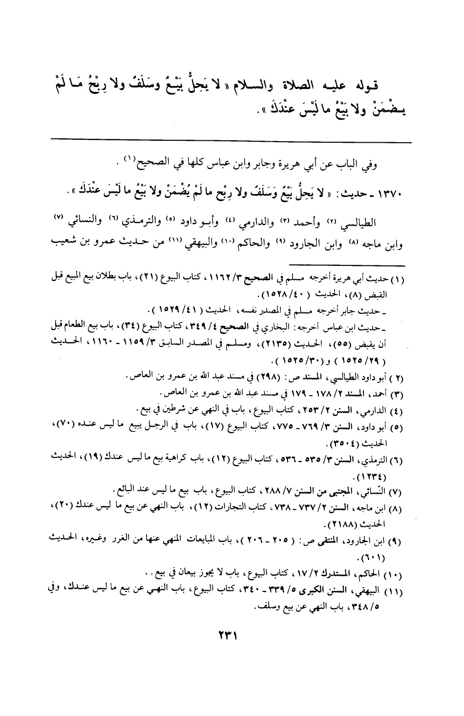1370 - حديث: "لا يَحِلُّ بَيْعٌ وَسَلَفٌ ولا رِبْح ما لَمْ يُضْمَنْ ولا بَيْعُ ما لَيْسَ عنْدَكَ".