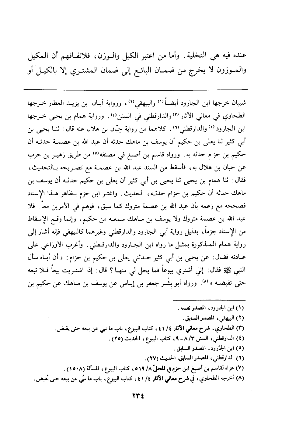 شيبان خرجها ابن الجارود أيضًا والبيهقي، ورواية أبان بن يزيد العطار خرجها الطحاوي في معاني الآثار والدارقطني في السنن، ورواية همام بن يحيى خرجها ابن الجارود والدارقطني، كلاهما من رواية حِبّان بن هلال عنه قال: ثنا يحيى بن أبي كثير ثنا يعلى بن حكيم أن يوسف بن ماهك حدثه أن عبد الله بن عصمة حدثه أن حكيم بن حزام حدثه به. ورواه قاسم بن أصبغ في مصنفه من طريق زهير بن حرب عن حبان بن هلال به، فأسقط من السند عبد الله بن عصمة مع تصريحه بالتحديث، فقال: ثنا همام بن يحيى ثنا يحيى بن أبي كثير أن يعلى بن حكيم حدثه أن يوسف بن ماهك حدثه أن حكيم بن حزام حدثه، الحديث. واغتر ابن حزم بظاهر هذا الإسناد فصححه مع زعمه بأن عبد الله بن عصمة متروك كما سبق، فوهم في الأمرين معًا. فلا عبد الله بن عصمة متروك ولا يوسف بن ماهك سمعه من حكيم، وإنما وقع الإسقاط من الإسناد جزمًا، بدليل رواية أبي الجارود والدارقطني وغيرهما كالبيهقي فإنه أشار إلى رواية همام المذكورة بمثل ما رواه ابن الجارود والدارقطني. وأغرب الأوزاعي على عادته فقال: عن يحيى بن أبي كثير حدثني يعلى بن حكيم بن حزام: "أن أباه سأل النبي - صلى الله عليه وسلم - فقال: إني أشتري بيوعًا فما يحل لي منها؟ قال: إذا اشتريت بيعًا فلا تبعه حتى تقبضه". ورواه أبو بِشْر جعفر بن إياس عن يوسف بن ماهك عن حكيم بن