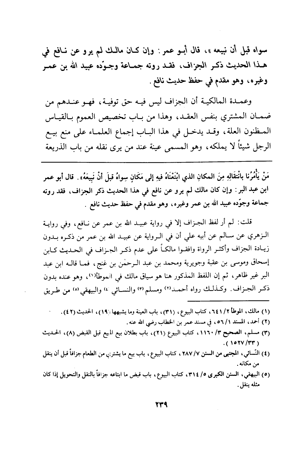 مَنْ يأمُرُنا بانْتقَالِهِ مِنَ المكانِ الذي ابْتَعْنَاه فيهِ إلى مَكَانٍ سِواهُ قبلَ أن نَبِيعَهُ". قال أبو عمر ابن عبد البر: وإن كان مالك لم يرو عن نافع في هذا الحديث ذكر الجزاف، فقد روته جماعة وجوّده عبيد الله بن عمر وغيره، وهو مقدم في حفظ حديث نافع.