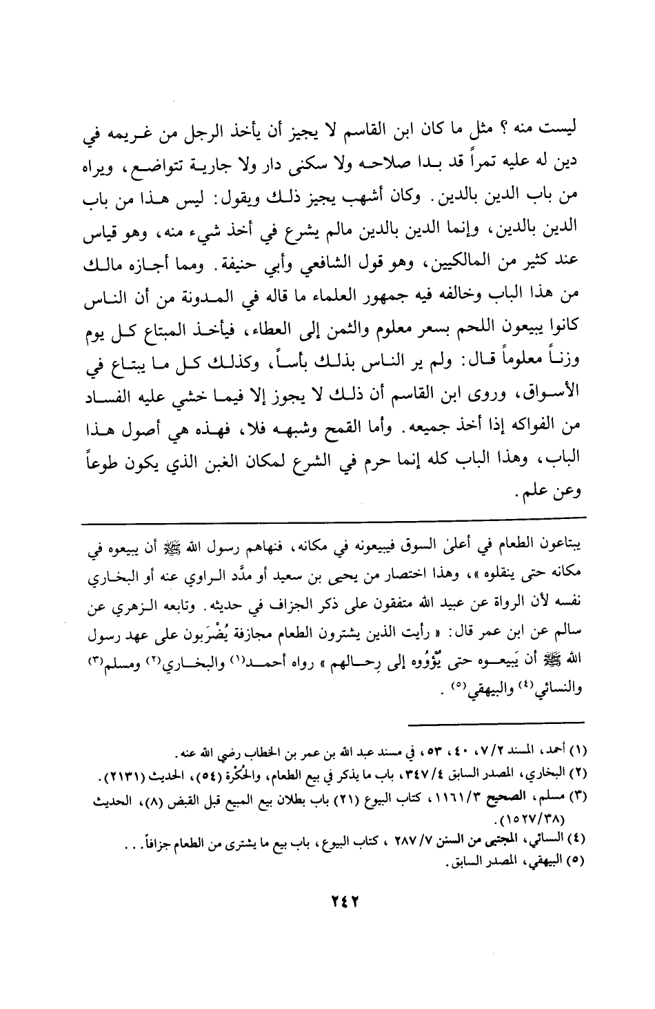 يبتاعون الطعام في أعلى السوق فيبيعونه في مكانه، فنهاهم رسول الله - صلى الله عليه وسلم - أن يبيعوه في مكانه حتى ينقلوه"، وهذا اختصار من يحيى بن سعيد أو مدَّد الراوي عنه أو البخاري نفسه لأن الرواة عن عبيد الله متفقون على ذكر الجزاف في حديثه. وتابعه الزهري عن سالم عن ابن عمر قال: "رأيت الذين يشترون الطعام مجازفة يُضْرَبون على عهد رسول الله - صلى الله عليه وسلم - أن يَبيعوه حتى يُؤوُوه إلى رِحالهم" رواه أحمد والبخاري ومسلم والنسائي والبيهقي.