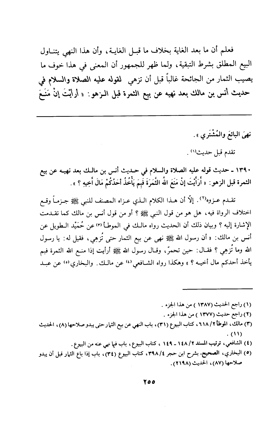 تقدم عزوه. إلَّا أن هذا الكلام الذي عزاه المصنف للنبي - صلى الله عليه وسلم - جزمًا وقع اختلاف الرواة فيه، هل هو من قول النبي - صلى الله عليه وسلم -؟ أو من قول أنس بن مالك كما تقدمت الإشارة إليه؟ وبيان ذلك أن الحديث رواه مالك في الموطأ عن حُمَيْد الطويل عن أنس بن مالك: "أن رسول الله - صلى الله عليه وسلم - نهى عن بيع الثمار حتى تُزهِي، فقيل له: يا رسول الله وما تُزهِي؟ فقال: حين تحمرّ، وقال رسول الله - صلى الله عليه وسلم - أرأيت إذا منع الله الثمرة فبم يأخذ أحدكم مال أخيه؟ " وهكذا رواه الشافعي عن مالك. والبخاري عن عبد