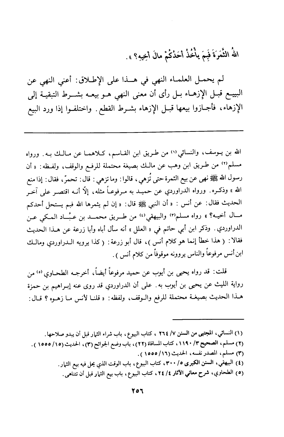 الله بن يوسف، والنسائي من طريق ابن القاسم، كلاهما عن مالك به. ورواه مسلم من طريق ابن وهب عن مالك بصيغة محتملة للرفع والوقف، ولفظه: "أن رسول الله - صلى الله عليه وسلم - نهى عن بيع الثمرة حتى تُزهي، قالوا: وما تزهي: قال: تحمر، فقال: إذا منع الله" وذكره. ورواه الدراوردي عن حميد به مرفوعًا مثله، إلَّا أنه اقتصر على آخر الحديث فقال: عن أنس: "أن النبي - صلى الله عليه وسلم - قال: "إن لم يثمرها الله فبم يستحل أحدكم مال أخيه؟ " رواه مسلم والبيهقي من طريق محمد بن عبَّاد المكي عن الدراوردي. وذكر ابن أبي حاتم في "العلل" أنه سأل أباه وأبا زرعة عن هذا الحديث فقالا: (هذا خطأ إنما هو كلام أنس)، قال أبو زرعة: (كذا يرويه الدراوردي ومالك بن أنس مرفوعًا والناس يروونه موقوفًا من كلام أنس).