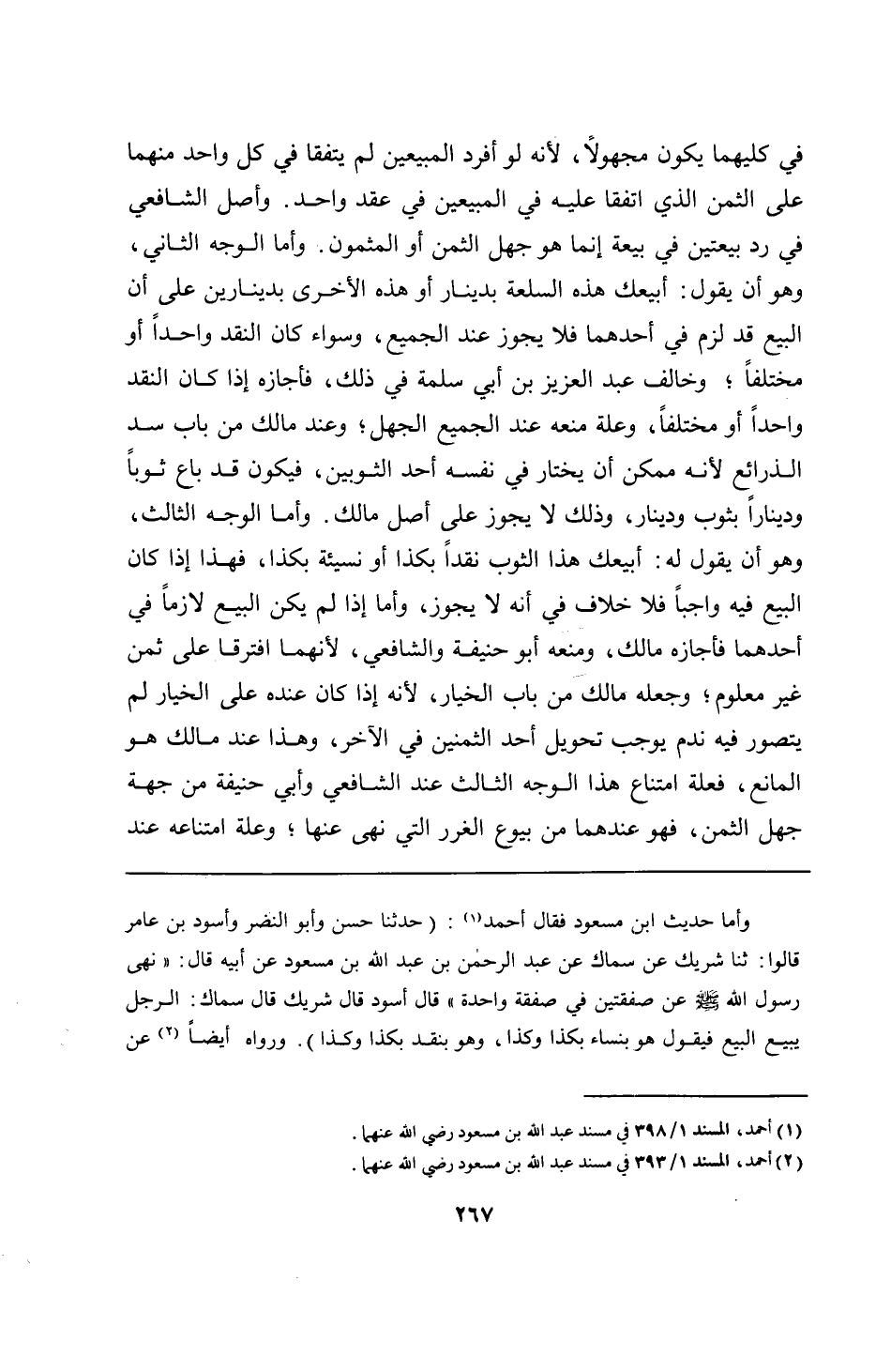 وأما حديث ابن مسعود فقال أحمد: (حدثنا حسن وأبو النضر وأسود بن عامر قالوا: ثنا شريك عن سماك عن عبد الرحمن بن عبد الله بن مسعود عن أبيه قال: "نهى رسول الله - صلى الله عليه وسلم - عن صفقتين في صفقة واحدة" قال أسود قال شريك قال سماك: الرجل يبيع البيع فيقول هو بنساء بكذا وكذا، وهو بنقد بكذا وكذا). ورواه أيضًا عن