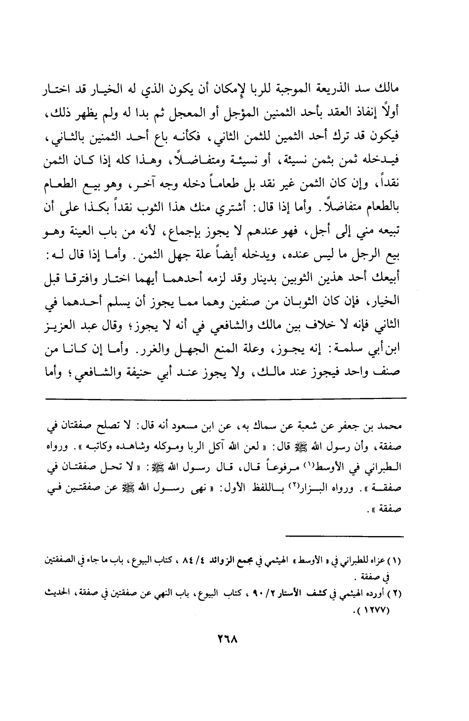 محمد بن جعفر عن شعبة عن سماك به، عن ابن مسعود أنه قال: لا تصلح صفقتان في صفقة، وأن رسول الله - صلى الله عليه وسلم - قال: "لعن الله آكل الربا وموكله وشاهده وكاتبه". ورواه الطبراني في الأوسط مرفوعًا قال، قال رسول الله - صلى الله عليه وسلم -: "لا تحل صفقتان في صفقة". ورواه البزار باللفظ الأول: "نهى رسول الله - صلى الله عليه وسلم - عن صفقتين في صفقة".