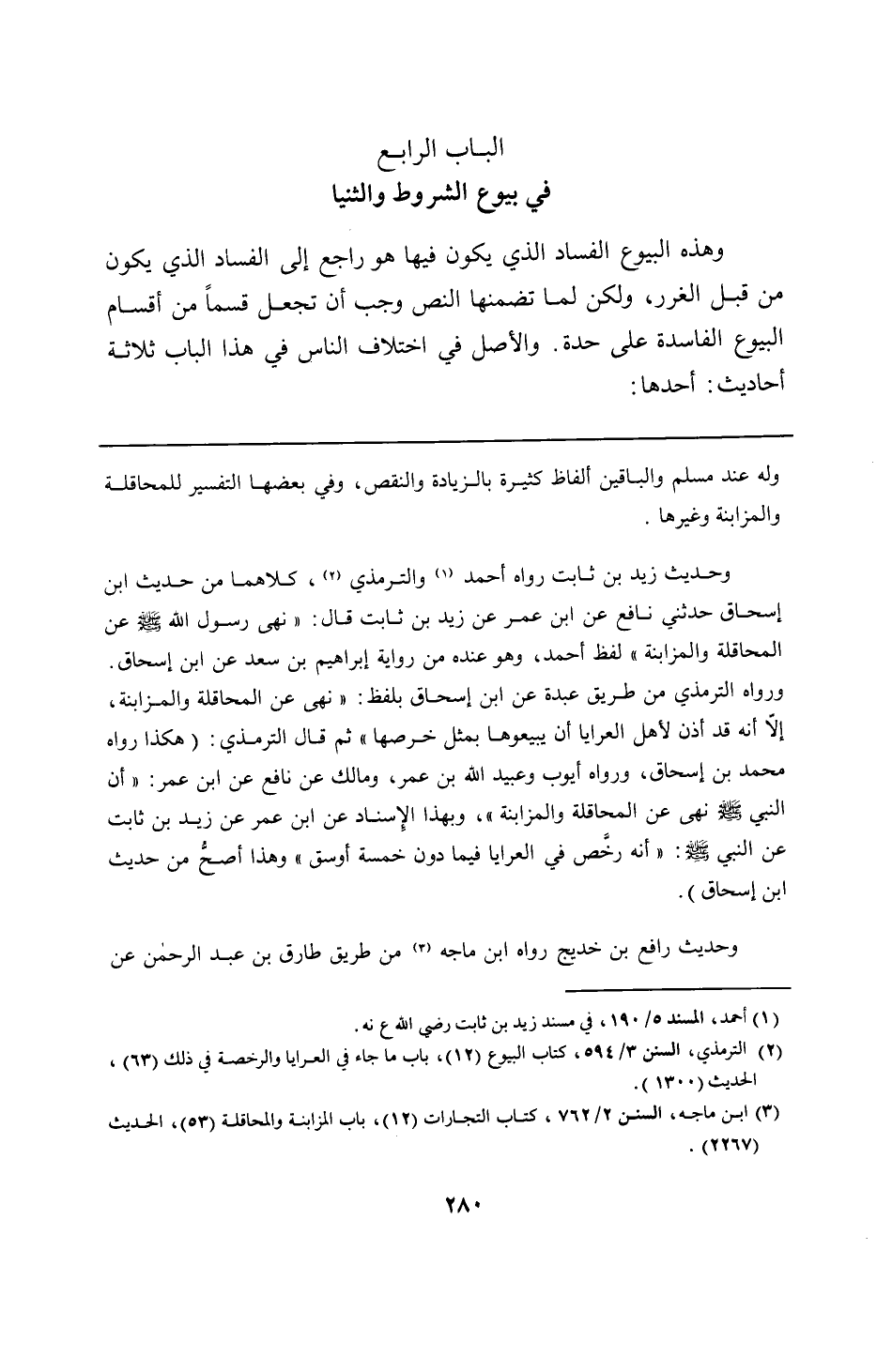 وحديث زيد بن ثابت رواه أحمد والترمذي، كلاهما من حديث ابن إسحاق حدثني نافع عن ابن عمر عن زيد بن ثابت قال: "نهى رسول الله - صلى الله عليه وسلم - عن المحاقلة والمزابنة" لفظ أحمد، وهو عنده من رواية إبراهيم بن سعد عن ابن إسحاق. ورواه الترمذي من طريق عبدة عن ابن إسحاق بلفظ: "نهى عن المحاقلة والمزابنة، إلّا أنه قد أذن لأهل العرايا أن يبيعوها بمثل خرصها" ثم قال الترمذي: (هكذا رواه محمد بن إسحاق، ورواه أيوب وعبيد الله بن عمر، ومالك عن نافع عن ابن عمر: "أن النبي - صلى الله عليه وسلم - نهى عن المحاقلة والمزابنة"، وبهذا الإسناد عن ابن عمر عن زيد بن ثابت عن النبي - صلى الله عليه وسلم -: "أنه رخَّص في العرايا فيما دون خمسة أوسق" وهذا أصحُّ من حديث ابن إسحاق).