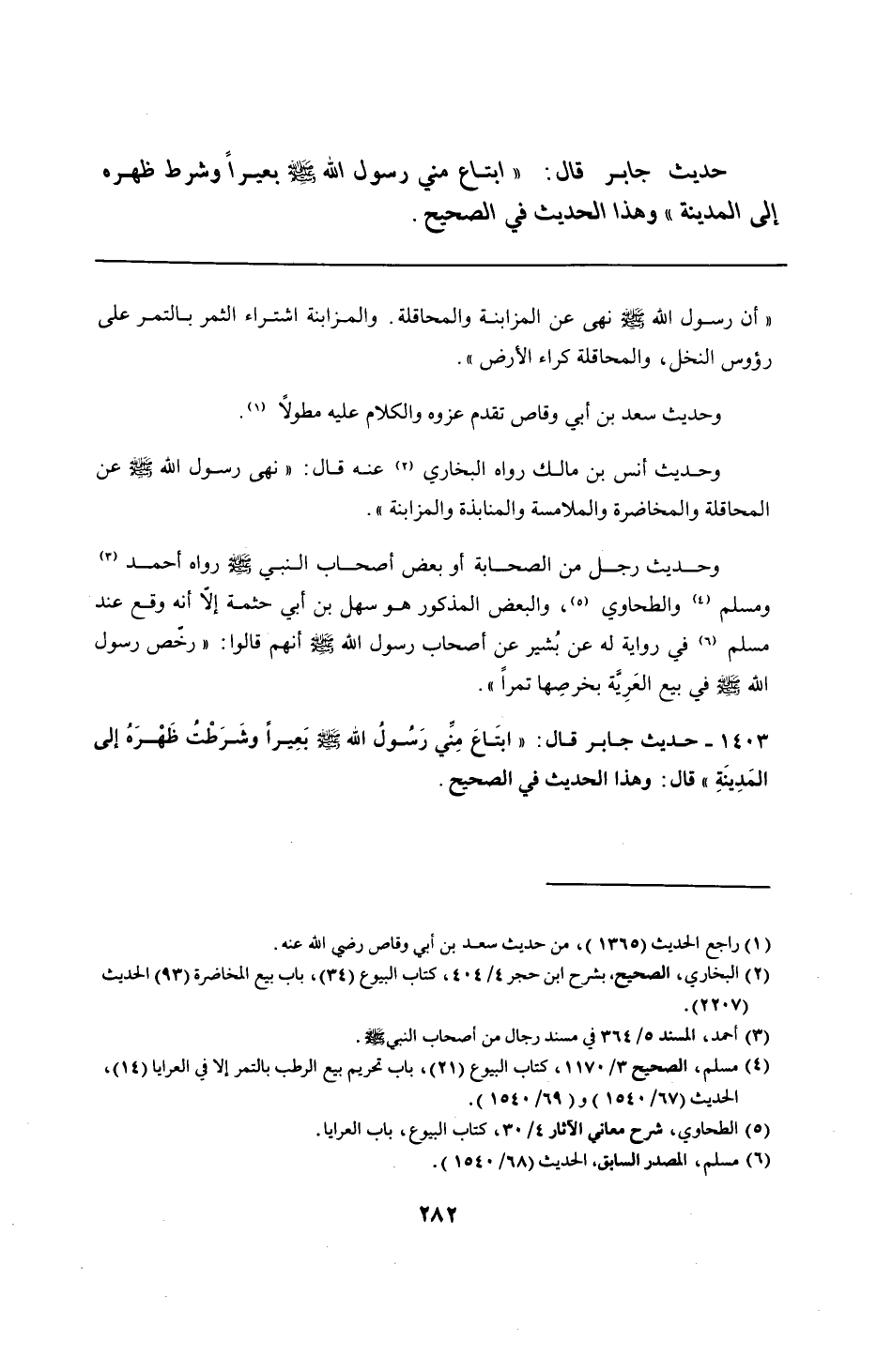 1403 - حديث جابر قال: "ابتَاعَ مِنِّي رَسولُ الله - صلى الله عليه وسلم - بَعِيرًا وشَرَطْتُ ظَهْرَهُ إلى المَدِينَةِ" قال: وهذا الحديث في الصحيح.