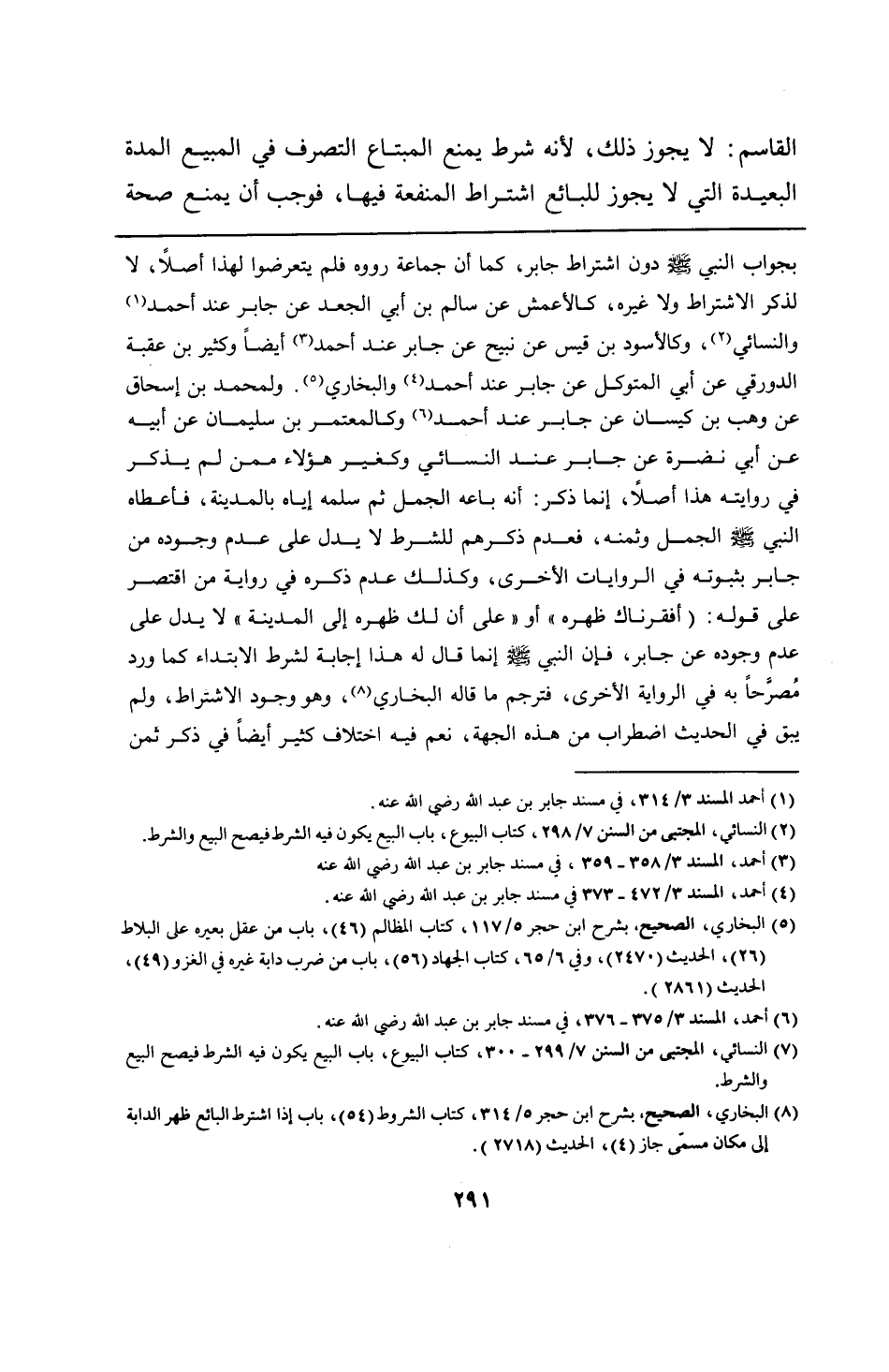 بجواب النبي - صلى الله عليه وسلم - دون اشتراط جابر، كما أن جماعة رووه فلم يتعرضوا لهذا أصلًا، لا لذكر الاشتراط ولا غيره، كالأعمش عن سالم بن أبي الجعد عن جابر عند أحمد والنسائي، وكالأسود بن قيس عن نبيح عن جابر عند أحمد أيضًا وكثير بن عقبة الدورقي عن أبي المتوكل عن جابر عند أحمد والبخاري. ولمحمد بن إسحاق عن وهب بن كيسان عن جابر عند أحمد وكالمعتمر بن سليمان عن أبيه عن أبي نضرة عن جابر عند النسائي وكغير هؤلاء ممن لم يذكر في روايته هذا أصلًا، إنما ذكر: أنه باعه الجمل ثم سلمه إياه بالمدينة، فأعطاه النبي - صلى الله عليه وسلم - الجمل وثمنه، فعدم ذكرهم للشرط لا يدل على عدم وجوده من جابر بثبوته في الروايات الأخرى، وكذلك عدم ذكره في رواية من اقتصر على قوله: (أفقرناك ظهره" أو "على أن لك ظهره إلى المدينة" لا يدل على عدم وجوده عن جابر، فإن النبي - صلى الله عليه وسلم - إنما قال له هذا إجابة لشرط الابتداء كما ورد مُصرَّحًا به في الرواية الأخرى، فترجم ما قاله البخاري، وهو وجود الاشتراط، ولم يبق في الحديث اضطراب من هذه الجهة، نعم فيه اختلاف كثير أيضًا في ذكر ثمن