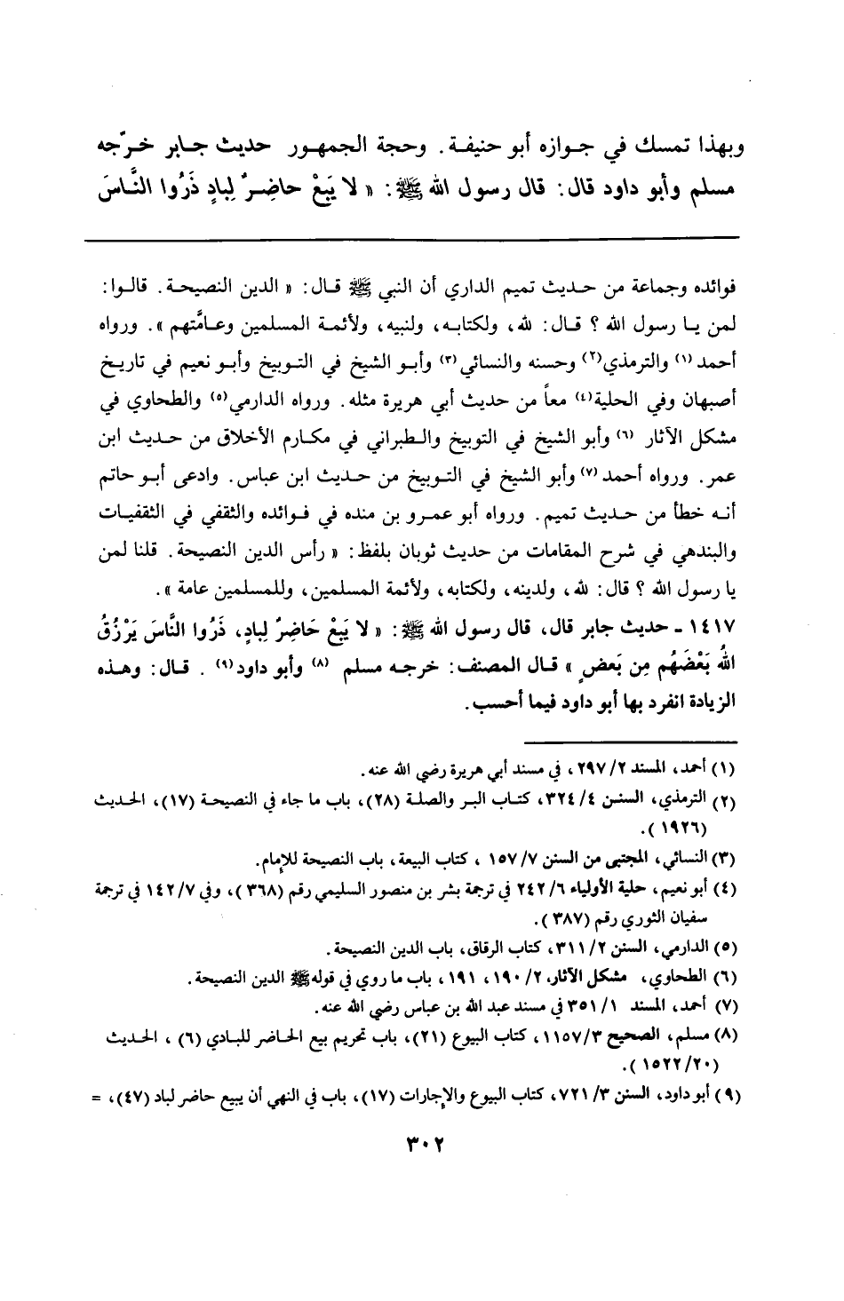1417 - حديث جابر قال، قال رسول الله - صلى الله عليه وسلم -: "لا يَبعْ حَاضِرٌ لِبادٍ، ذَرُوا النَّاسَ يَرْزُقُ الله بَعْضَهُم مِن بَعضٍ" قال المصنف: خرجه مسلم وأبو داود. قال: وهذه الزيادة انفرد بها أبو داود فيما أحسب.