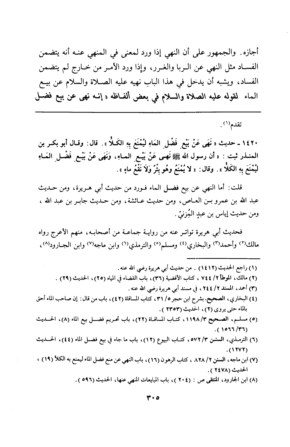 1420 - حديث "نَهَى عَنْ بَيْعِ فَضْلِ المَاءِ ليُمْنَعَ بِهِ الكَلأ". قال: وقال أبو بكر بن المنذر ثبت: "أن رسول الله - صلى الله عليه وسلم - نهى عَنْ بَيعِ الماءِ، وَنَهَى عَنْ بَيْعِ فَضْلِ المَاءِ ليُمْنَعَ بِهِ الكَلأ". وقال: "لا يُمْنَعُ وهُو بِئْرٌ وَلَا نَقْعُ ماءٍ".