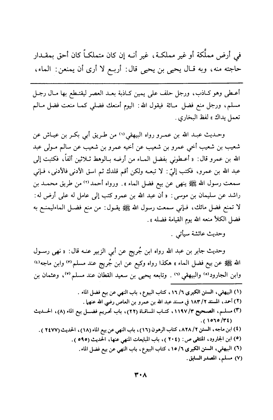 وحديث عبد الله بن عمرو رواه البيهقي من طريق أبي بكر بن عياش عن شعيب بن شعيب أخي عمرو بن شعيب عن أخيه عمرو بن شعيب عن سالم مولى عبد الله بن عمرو قال: "أعطوني بفضل الماء من أرضه بالوهط ثلاثين ألفًا، فكتبت إلى عبد الله بن عمرو، فكتب إليّ: لا تبعه ولكن أقم قلدك ثم اسق الأدنى فالأدنى، فإني سمعت رسول الله - صلى الله عليه وسلم - ينهى عن بيع فضل الماء". ورواه أحمد من طريق محمد بن راشد عن سليمان بن موسى: "أن عبد الله بن عمرو كتب إلى عامل له على أرض له: لا تمنع فضل مائك، فإني سمعت رسول الله - صلى الله عليه وسلم - يقول: من منع فضل الماء ليمنع به فضل الكلأ منعه الله يوم القيامة فضله".