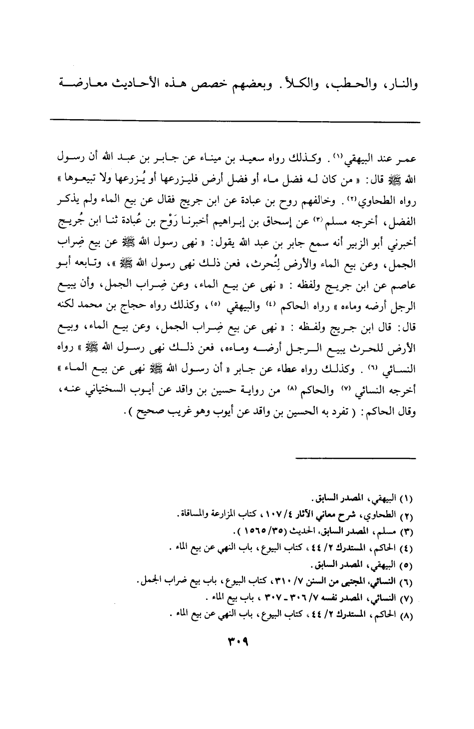 عمر عند البيهقي. وكذلك رواه سعيد بن ميناء عن جابر بن عبد الله أن رسول الله - صلى الله عليه وسلم - قال: "من كان له فضل ماء أو فضل أرض فليزرعها أو يُزرعها ولا تبيعوها" رواه الطحاوي. وخالفهم روح بن عبادة عن ابن جريج فقال عن بيع الماء ولم يذكر الفضل، أخرجه مسلم عن إسحاق بن إبراهيم أخبرنا رَوْح بن عُبادة ثنا ابن جُريج أخبرني أبو الزبير أنه سمع جابر بن عبد الله يقول: "نهى رسول الله - صلى الله عليه وسلم - عن بيع ضِراب الجمل، وعن بيع الماء والأرض لِتُحرث، فعن ذلك نهى رسول الله - صلى الله عليه وسلم -"، وتابعه أبو عاصم عن ابن جريج ولفظه: "نهى عن بيع الماء، وعن ضِراب الجمل، وأن يبيع الرجل أرضه وماءه" رواه الحاكم والبيهقي، وكذلك رواه حجاج بن محمد لكنه قال: قال ابن جريج ولفظه: "نهى عن بيع ضِراب الجمل، وعن بيع الماء، وبيع الأرض للحرث يبيع الرجل أرضه وماءه، فعن ذلك نهى رسول الله - صلى الله عليه وسلم -" رواه النسائي. وكذلك رواه عطاء عن جابر "أن رسول الله - صلى الله عليه وسلم - نهى عن بيع الماء" أخرجه النسائي والحاكم من رواية حسين بن واقد عن أيوب السختياني عنه، وقال الحاكم: (تفرد به الحسين بن واقد عن أيوب وهو غريب صحيح).