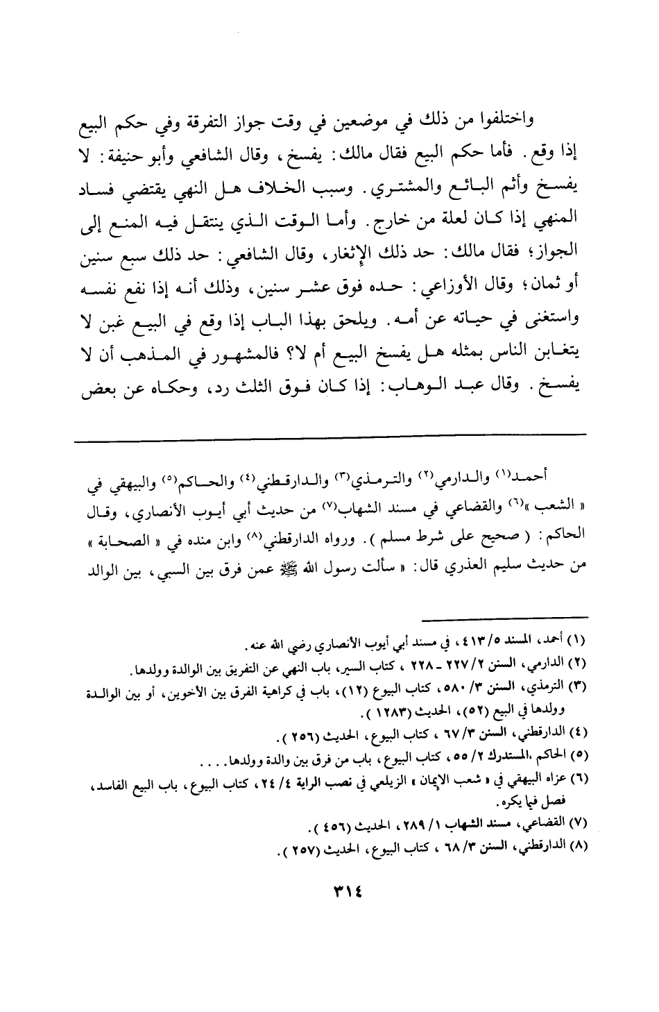 أحمد والدارمي والترمذي والدارقطني والحاكم والبيهقي في "الشعب" والقضاعي في مسند الشهاب من حديث أبي أيوب الأنصاري، وقال الحاكم: (صحيح على شرط مسلم). ورواه الدارقطني وابن منده في "الصحابة" من حديث سليم العذري قال: "سألت رسول الله - صلى الله عليه وسلم - عمن فرق بين السبي، بين الوالد