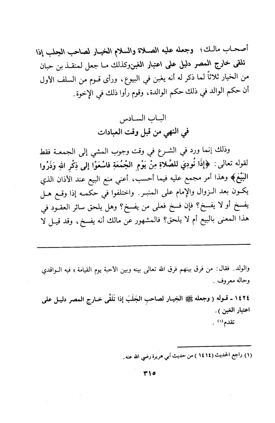 1424 - قوله (وجعله - صلى الله عليه وسلم - الخِيار لصاحبِ الجَلَبَ إذا تَلَقَّى خارج المصر دليل على اعتبار الغبن).