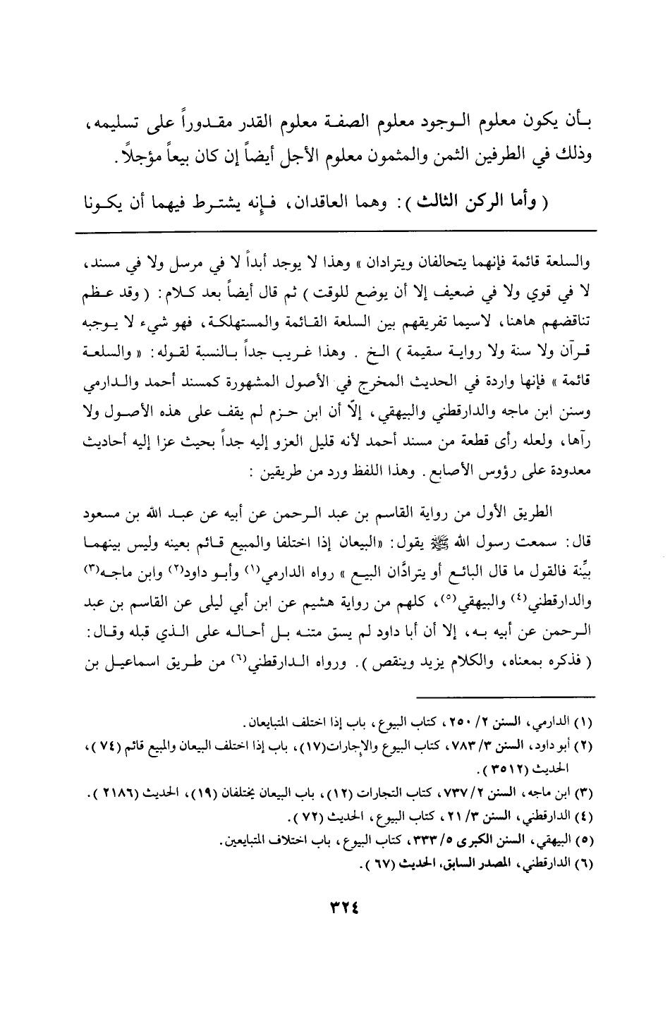 والسلعة قائمة فإنهما يتحالفان ويترادان" وهذا لا يوجد أبدًا لا في مرسل ولا في مسند، لا في قوي ولا في ضعيف إلا أن يوضع للوقت) ثم قال أيضًا بعد كلام: (وقد عظم تناقضهم هاهنا، لاسيما تفريقهم بين السلعة القائمة والمستهلكة، فهو شيء لا يوجبه قرآن ولا سنة ولا رواية سقيمة) الخ. وهذا غريب جدًا بالنسبة لقوله: "والسلعة قائمة" فإنها واردة في الحديث المخرج في الأصول المشهورة كمسند أحمد والدارمي وسنن ابن ماجه والدارقطني والبيهقي، إلَّا أن ابن حزم لم يقف على هذه الأصول ولا رآها، ولعله رأى قطعة من مسند أحمد لأنه قليل العزو إليه جدًا بحيث عزا إليه أحاديث معدودة على رؤوس الأصابع. وهذا اللفظ ورد من طريقين: