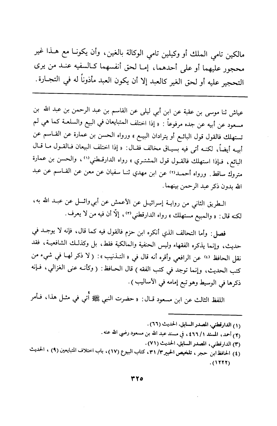 عياش ثنا موسى بن عقبة عن ابن أبي ليلى عن القاسم بن عبد الرحمن بن عبد الله بن مسعود عن أبيه عن جده مرفوعًا: "إذا اختلف المتبايعان في البيع والسلعة كما هي لم تستهلك فالقول قول البائع أو يترادان البيع" ورواه الحسن بن عمارة عن القاسم عن أبيه أيضًا، لكنه أتى فيه بسياق مخالف فقال: "إذا اختلف البيعان فالقول ما قال البائع، فإذا استهلك فالقول قول المشتري" رواه الدارقطني، والحسن بن عمارة متروك ساقط. ورواه أحمد عن ابن مهدي ثنا سفيان عن معن عن القاسم عن عبد الله بدون ذكر عبد الرحمن بينهما.