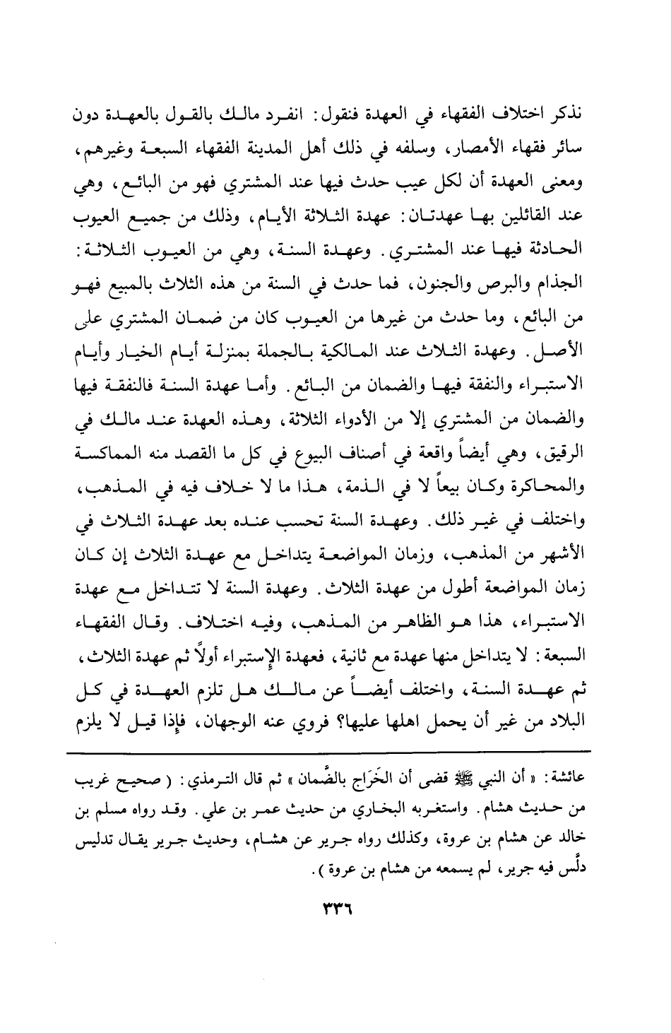عائشة: "أن النبي - صلى الله عليه وسلم - قضى أن الخَرَاج بالضَّمان" ثم قال الترمذي: (صحيح غريب من حديث هشام. واستغربه البخاري من حديث عمر بن علي. وقد رواه مسلم بن خالد عن هشام بن عروة، وكذلك رواه جرير عن هشام، وحديث جرير يقال تدليس دلَّس فيه جرير، لم يسمعه من هشام بن عروة).