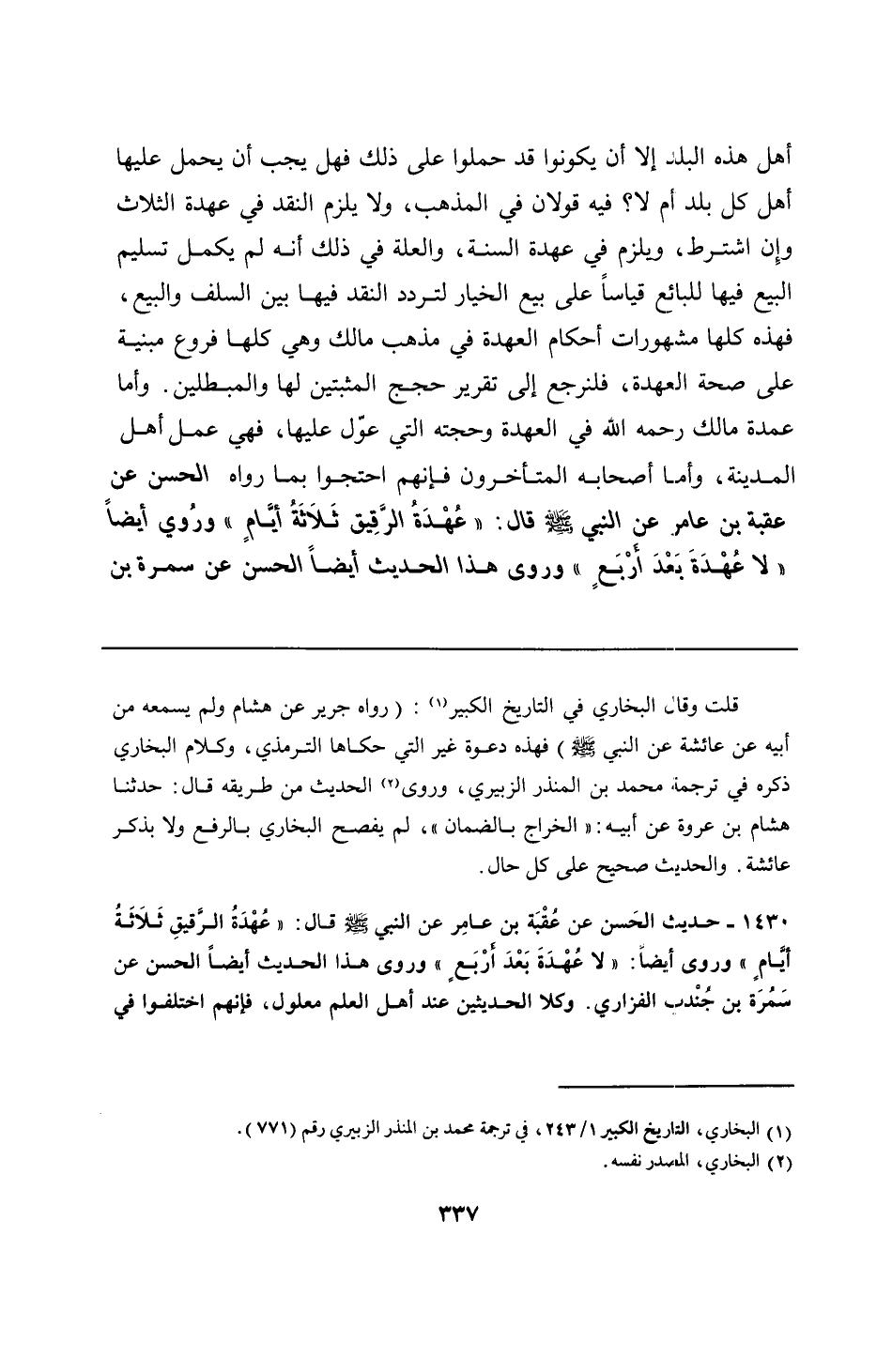 1430 - الحَسن عن عُقْبَة بن عامِر عن النبي - صلى الله عليه وسلم - قال: "عُهْدَةُ الرَّقيقِ ثَلَاثَةُ أيَّامٍ" وروى أيضًا: "لا عُهْدَةَ بَعْدَ أرْبَعٍ" وروى هذا الحديث أيضًا الحسن عن سَمُرَة بن جُنْدب الفزاري. وكلا الحديثين عند أهل العلم معلول، فإنهم اختلفوا في