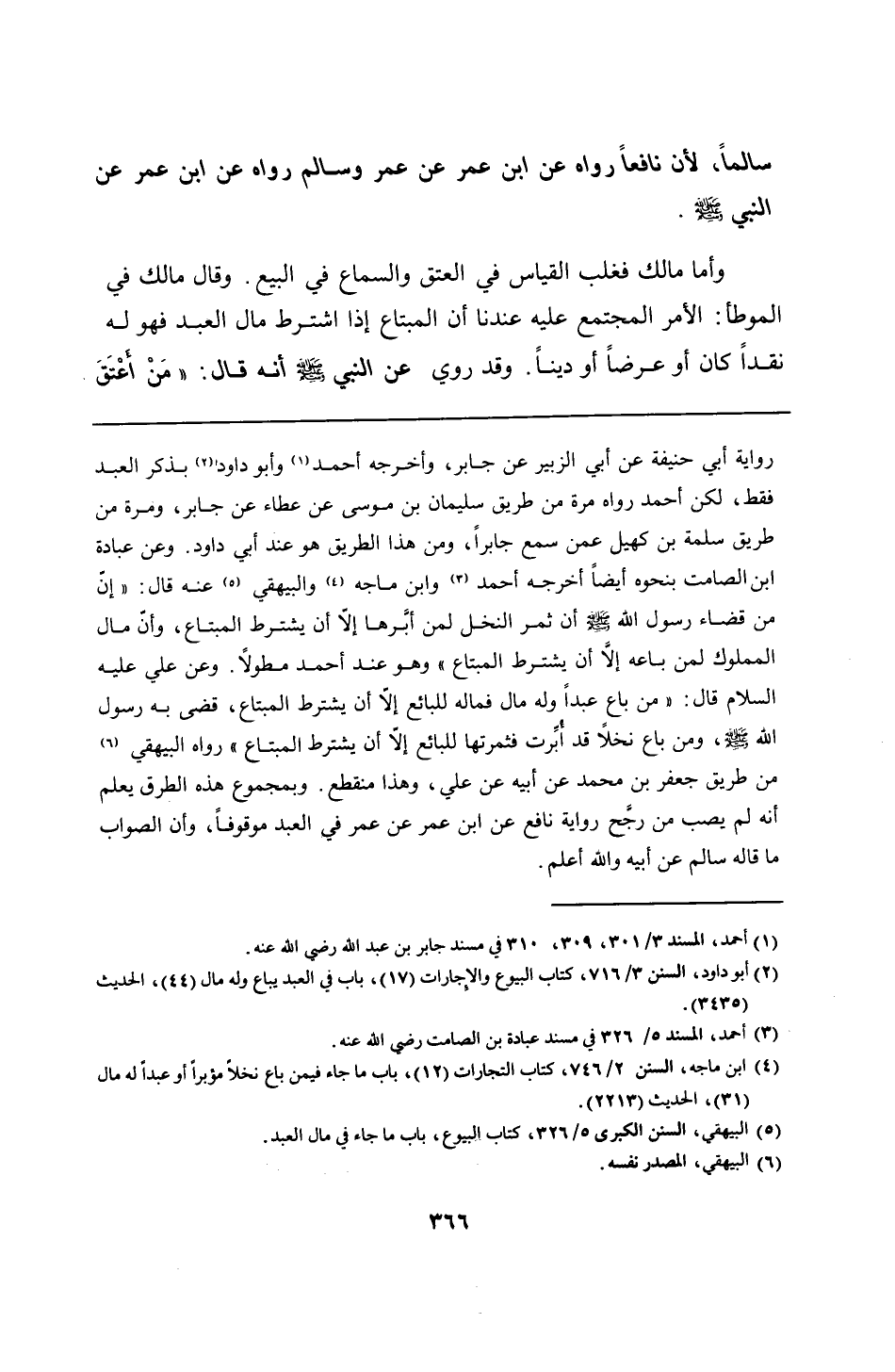 رواية أبي حنيفة عن أبي الزبير عن جابر، وأخرجه أحمد وأبو داود بذكر العبد فقط، لكن أحمد رواه مرة من طريق سليمان بن موسى عن عطاء عن جابر، ومرة من طريق سلمة بن كهيل عمن سمع جابرًا، ومن هذا الطريق هو عند أبي داود. وعن عبادة بن الصامت بنحوه أيضًا أخرجه أحمد وابن ماجه والبيهقي عنه قال: "إنَّ من قضاء رسول الله - صلى الله عليه وسلم - أن ثمر النخل لمن أبَّرها إلَّا أن يشترط المبتاع، وأن مال المملوك لمن باعه إلَّا أن يشترط المبتاع" وهو عند أحمد مطولًا. وعن علي -عليه السلام- قال: "من باع عبدًا وله مال فماله للبائع إلَّا أن يشترط المبتاع، قضى به رسول الله - صلى الله عليه وسلم -، ومن باع نخلًا قد أُبِّرت فثمرتها للبائع إلَّا أن يشترط المبتاع" رواه البيهقي من طريق جعفر بن محمد عن أبيه عن علي، وهذا منقطع. وبمجموع هذه الطرق يعلم أنه لم يصب من رجَّح رواية نافع عن ابن عمر عن عمر في العبد موقوفًا، وأن الصواب ما قاله سالم عن أبيه والله أعلم.
