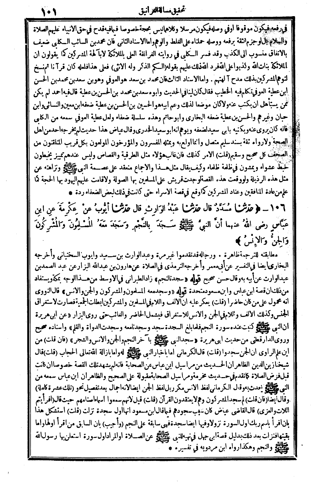 فِي رَفعه، فَيكون مَوْقُوفا. وَفِي وَصله فَيكون مُرْسلا، وَكِلَاهُمَا لَيْسَ بِحجَّة خُصُوصا فِيمَا فِيهِ قدح فِي حق الْأَنْبِيَاء، عَلَيْهِم الصَّلَاة وَالسَّلَام، بل لَو جزم الثِّقَة بِرَفْعِهِ وَوَصله حملناه على الْغَلَط وَالوهم، وَأما الْإِسْنَاد الثَّانِي: فَإِن مُحَمَّد بن السَّائِب الْكَلْبِيّ ضَعِيف بالِاتِّفَاقِ، مَنْسُوب إِلَى الْكَذِب، وَقد فسر الْكَلْبِيّ فِي رِوَايَته الغرانقة العلى: بِالْمَلَائِكَةِ، لَا بآلهة الْمُشْركين، كَمَا يَقُولُونَ: إِن الْمَلَائِكَة بَنَات الله، وكذبوا على الله فَرد الله ذَلِك عَلَيْهِم بقوله: {ألكم الذّكر وَله الْأُنْثَى} (النَّجْم: 12) . فعلى هَذَا فَلَعَلَّهُ كَانَ قُرْآنًا ثمَّ نسخ لتوهم الْمُشْركين بذلك مدح آلِهَتهم. وَأما الْإِسْنَاد الثَّالِث: فَإِن مُحَمَّد بن سعد هُوَ الْعَوْفِيّ، وَهُوَ ابْن سعد بن مُحَمَّد بن الْحسن ابْن عَطِيَّة الْعَوْفِيّ، تكلم فِيهِ الْخَطِيب، فَقَالَ: كَانَ لينًا فِي الحَدِيث، وَأَبوهُ سعد بن مُحَمَّد بن الْحسن بن عَطِيَّة، قَالَ فِيهِ أَحْمد: لم يكن مِمَّن يستأهل أَن يكْتب عَنهُ، وَلَا كَانَ موضعا لذَلِك، وَعم أَبِيه: هُوَ الْحُسَيْن بن الْحسن بن عَطِيَّة، ضعفه ابْن معِين وَالنَّسَائِيّ وَابْن حبَان وَغَيرهم، وَالْحسن بن عَطِيَّة ضعفه البُخَارِيّ وَأَبُو حَاتِم، وَهَذِه سلسلة ضعفاء، وَلَعَلَّ عَطِيَّة الْعَوْفِيّ سَمعه من الْكَلْبِيّ فَإِنَّهُ كَانَ يروي عَنهُ ويكنيه بِأبي سعيد لضَعْفه، ويوهم أَنه: أَبُو سعيد الْخُدْرِيّ. وَقَالَ عِيَاض: هَذَا حَدِيث لم يُخرجهُ أحد من أهل الصِّحَّة. وَلَا رُوَاة ثِقَة بِسَنَد سليم مُتَّصِل، وَإِنَّمَا أولع بِهِ وبمثله الْمُفَسِّرُونَ، والمؤرخون المولعون بِكُل قريب، المتلقنون من الصُّحُف كل صَحِيح وَسَقِيم. قلت: الْأَمر كَذَلِك، فَإِن غَالب هَؤُلَاءِ مثل الطرقية وَالْقصاص وَلَيْسَ عِنْدهم تَمْيِيز، يخبطون خبط عشواء، ويمشون فِي ظلمَة ظلماء، وَكَيف يُقَال مثل هَذَا وَالْإِجْمَاع مُنْعَقد على عصمَة النَّبِي صلى الله عَلَيْهِ وَسلم ونزاهته عَن مثل هَذِه الرذيلة؟ وَلَو وَقعت هَذِه الْقِصَّة لوجدت قُرَيْش على الْمُسلمين بهَا الصولة، ولأقامت عَلَيْهِم الْيَهُود بهَا الْحجَّة، كَمَا علم من عَادَة الْمُنَافِقين وعناد الْمُشْركين، كَمَا وَقع فِي قصَّة الْإِسْرَاء حَتَّى كَانَت فِي ذَلِك لبَعض الضُّعَفَاء ردة.