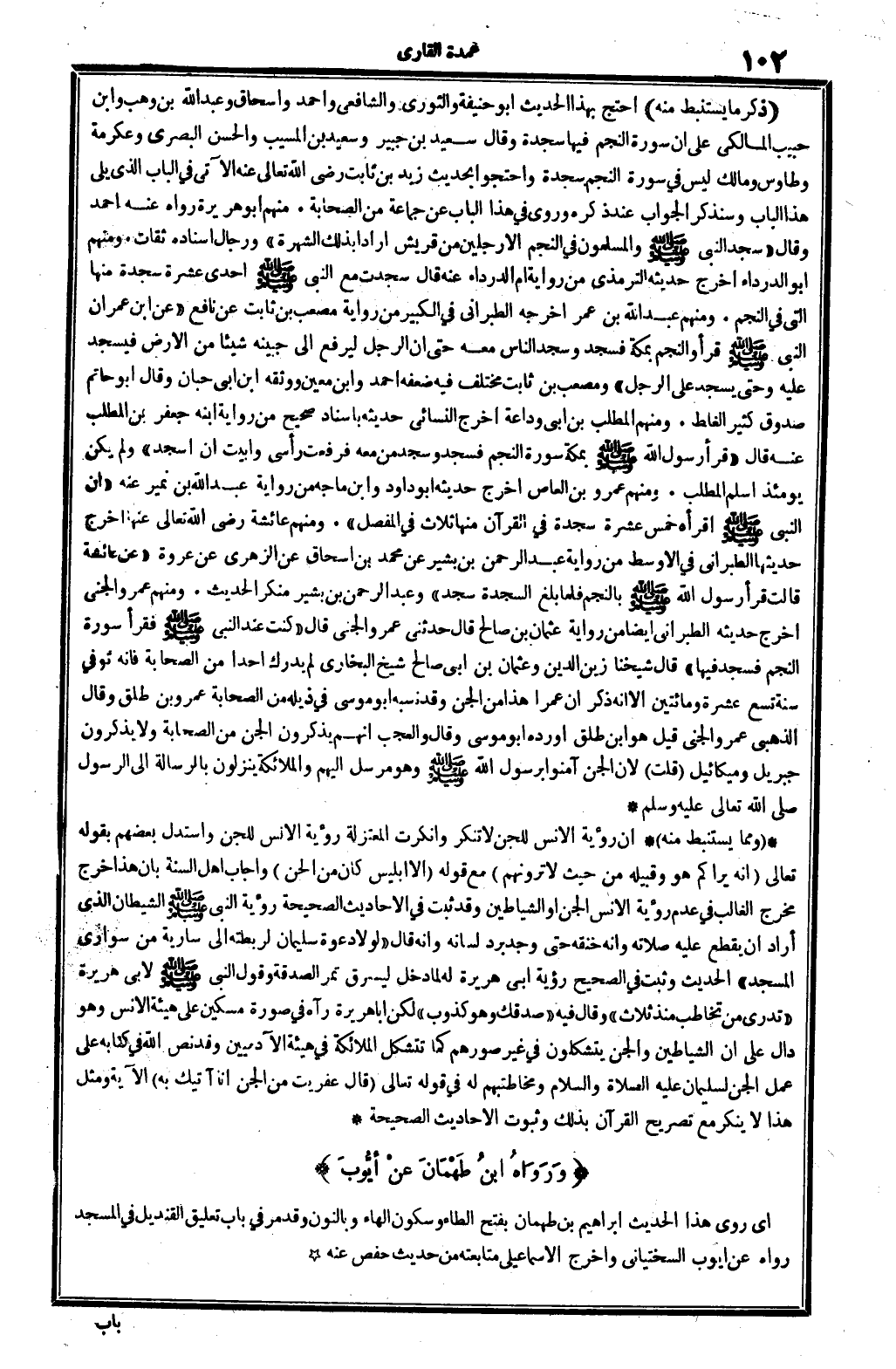 ذكر مَا يستنبط مِنْهُ: احْتج بِهَذَا الحَدِيث أَبُو حنيفَة وَالثَّوْري وَالشَّافِعِيّ وَأحمد وَإِسْحَاق وَعبد الله بن وهب وَابْن حبيب الْمَالِكِي على أَن سُورَة النَّجْم فِيهَا سَجْدَة، وَقَالَ سعيد بن جُبَير وَسَعِيد بن الْمسيب وَالْحسن الْبَصْرِيّ وَعِكْرِمَة وطاووس وَمَالك: لَيْسَ فِي سُورَة النَّجْم سَجْدَة، وَاحْتَجُّوا بِحَدِيث زيد بن ثَابت، رَضِي الله تَعَالَى عَنهُ، الْآتِي فِي الْبَاب الَّذِي يَلِي هَذَا الْبَاب، وَسَنذكر الْجَواب عِنْد ذكره، وَرُوِيَ فِي هَذَا الْبَاب عَن جمَاعَة من الصَّحَابَة. مِنْهُم: أَبُو هُرَيْرَة رَوَاهُ عَنهُ أَحْمد وَقَالَ: (سجد النَّبِي صلى الله عَلَيْهِ وَسلم والمسلمون فِي النَّجْم إلاّ رجلَيْنِ من قُرَيْش أَرَادَا بذلك الشُّهْرَة) . وَرِجَال إِسْنَاده ثِقَات. وَمِنْهُم: أَبُو الدَّرْدَاء أخرج حَدِيثه التِّرْمِذِيّ من رِوَايَة أم الدَّرْدَاء عَنهُ. قَالَ: سجدت مَعَ النَّبِي صلى الله عَلَيْهِ وَسلم إِحْدَى عشرَة سَجْدَة، مِنْهَا الَّتِي فِي النَّجْم. وَمِنْهُم: عبد الله بن عمر، أخرجه الطَّبَرَانِيّ فِي (الْكَبِير) من رِوَايَة مُصعب بن ثَابت عَن نَافِع (عَن ابْن عمر أَن النَّبِي صلى الله عَلَيْهِ وَسلم قَرَأَ: والنجم، بِمَكَّة فَسجدَ وَسجد النَّاس مَعَه حَتَّى إِن الرجل ليرْفَع إِلَى جَبينه شَيْئا من الأَرْض فَيسْجد عَلَيْهِ، وَحَتَّى يسْجد على الرجل) ، وَمصْعَب بن ثَابت مُخْتَلف فِيهِ، ضعفه أَحْمد وَابْن معِين وَوَثَّقَهُ ابْن أبي حبَان، وَقَالَ أَبُو حَاتِم: صَدُوق كثير الْغَلَط. وَمِنْهُم: الْمطلب بن أبي ودَاعَة، أخرج النَّسَائِيّ حَدِيثه بِإِسْنَاد صَحِيح من رِوَايَة ابْنه جَعْفَر بن الْمطلب عَنهُ، قَالَ: (قَرَأَ رَسُول الله صلى الله عَلَيْهِ وَسلم بِمَكَّة سُورَة النَّجْم فَسجدَ وَسجد من مَعَه، فَرفعت رَأْسِي وأبيت أَن أَسجد) ، وَلم يكن يَوْمئِذٍ أسلم الْمطلب. وَمِنْهُم: عَمْرو بن الْعَاصِ، أخرج حَدِيثه أَبُو دَاوُد وَابْن مَاجَه من رِوَايَة عبد الله بن نمير عَنهُ (أَن النَّبِي صلى الله عَلَيْهِ وَسلم أقرأه خمس عشرَة سَجْدَة فِي الْقُرْآن، مِنْهَا ثَلَاث فِي الْمفصل) . وَمِنْهُم: عَائِشَة، رَضِي الله تَعَالَى عَنْهَا: أخرج حَدِيثهَا الطَّبَرَانِيّ فِي (الْأَوْسَط) من رِوَايَة عبد الرَّحْمَن بن بشير عَن مُحَمَّد بن إِسْحَاق عَن الزُّهْرِيّ عَن عُرْوَة (عَن عَائِشَة قَالَت: قَرَأَ رَسُول الله صلى الله عَلَيْهِ وَسلم بِالنَّجْمِ، فَلَمَّا بلغ السَّجْدَة سجد) . وَعبد الرَّحْمَن بن بشير مُنكر الحَدِيث. وَمِنْهُم: عَمْرو الجني، أخرج حَدِيثه الطَّبَرَانِيّ أَيْضا من رِوَايَة عُثْمَان بن صَالح، قَالَ: حَدثنِي عَمْرو الجني قَالَ: (كنت عِنْد النَّبِي صلى الله عَلَيْهِ وَسلم فَقَرَأَ سُورَة النَّجْم فَسجدَ فِيهَا) . قَالَ شَيخنَا زين الدّين: وَعُثْمَان بن أبي صَالح شيخ البُخَارِيّ لم يدْرك أحدا من الصَّحَابَة، فَإِنَّهُ توفّي سنة تسع عشرَة وَمِائَتَيْنِ، إلاّ أَنه ذكر أَن عمرا هَذَا من الْجِنّ، وَقد نسبه أَبُو مُوسَى فِي (ذيله) : من الصَّحَابَة عَمْرو بن طلق، وَقَالَ الذَّهَبِيّ: عَمْرو الجني، قيل: هُوَ ابْن طلق، أوردهُ أَبُو مُوسَى، وَقَالَ: وَالْعجب أَنهم يذكرُونَ الْجِنّ من الصَّحَابَة وَلَا يذكرُونَ جِبْرِيل وَمِيكَائِيل؟ قلت: لِأَن الْجِنّ آمنُوا برَسُول الله صلى الله عَلَيْهِ وَسلم وَهُوَ مُرْسل إِلَيْهِم، وَالْمَلَائِكَة ينزلون بالرسالة إِلَى الرَّسُول، صلى الله عَلَيْهِ وَسلم.