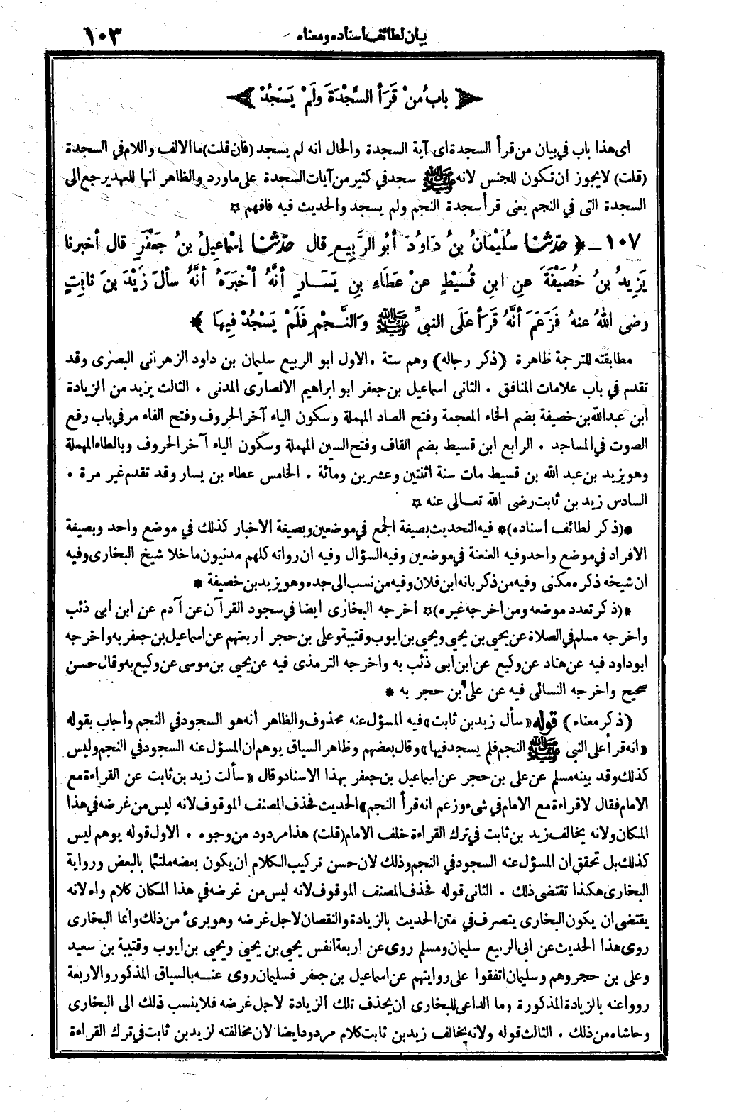 ذكر مَعْنَاهُ: قَوْله: (سَأَلَ (زيد بن ثَابت) ، فِيهِ المسؤول عَنهُ مَحْذُوف، وَالظَّاهِر أَنه هُوَ السُّجُود فِي النَّجْم، وَأجَاب بقوله: (أَنه قَرَأَ على النَّبِي صلى الله عَلَيْهِ وَسلم النَّجْم فَلم يسْجد فِيهَا) . وَقَالَ بَعضهم: وَظَاهر السِّيَاق يُوهم أَن المسؤول عَنهُ السُّجُود فِي النَّجْم وَلَيْسَ كَذَلِك، وَقد بَينه مُسلم عَن عَليّ بن حجر عَن إِسْمَاعِيل بن جَعْفَر بِهَذَا الْإِسْنَاد، وَقَالَ: (سَأَلت زيد بن ثَابت عَن الْقِرَاءَة مَعَ الإِمَام، فَقَالَ: لَا قِرَاءَة مَعَ الإِمَام فِي شَيْء، وَزعم أَنه قَرَأَ النَّجْم. .) الحَدِيث فَحذف المُصَنّف الْمَوْقُوف لِأَنَّهُ لَيْسَ من غَرَضه فِي هَذَا الْمَكَان، وَلِأَنَّهُ يُخَالف زيد بن ثَابت فِي ترك الْقِرَاءَة خلف الإِمَام. قلت: هَذَا مَرْدُود من وُجُوه: الأول: قَوْله: يُوهم، لَيْسَ كَذَلِك، بل تحقق أَن المسؤول عَنهُ السُّجُود فِي النَّجْم، وَذَلِكَ لِأَن حسن تركيب الْكَلَام أَن يكون بعضه ملتئما بِالْبَعْضِ، وَرِوَايَة البُخَارِيّ هَكَذَا تَقْتَضِي ذَلِك. الثَّانِي: قَوْله: فَحذف المُصَنّف الْمَوْقُوف، لِأَنَّهُ لَيْسَ من غَرَضه فِي هَذَا الْمَكَان، كَلَام واهٍ لِأَنَّهُ يَقْتَضِي أَن يكون البُخَارِيّ يتَصَرَّف فِي متن الحَدِيث بِالزِّيَادَةِ وَالنُّقْصَان لأجل غَرَضه وَهُوَ بَرِيء من ذَلِك وَإِنَّمَا البُخَارِيّ روى هَذَا الحَدِيث عَن أبي الرّبيع سُلَيْمَان وَسلم روى عَن أَرْبَعَة أنفس يحيى بن يحيى وَيحيى بن أَيُّوب وقتيبة بن سعيد وعَلى بن حجر، وهم وَسليمَان اتَّفقُوا على روايتهم عَن إِسْمَاعِيل بن جَعْفَر، فسليمان روى عَنهُ بالسياق الْمَذْكُور، وَالْأَرْبَعَة رووا عَنهُ بِالزِّيَادَةِ الْمَذْكُورَة، وَمَا الدَّاعِي للْبُخَارِيّ أَن يحذف تِلْكَ الزِّيَادَة لأجل غَرَضه؟ فَلَا ينْسب ذَلِك إِلَى البُخَارِيّ وحاشاه من ذَلِك. الثَّالِث: قَوْله: وَلِأَنَّهُ يُخَالف زيد بن ثَابت، كَلَام مَرْدُود أَيْضا، لِأَن مُخَالفَته لزيد بن ثَابت فِي ترك الْقِرَاءَة