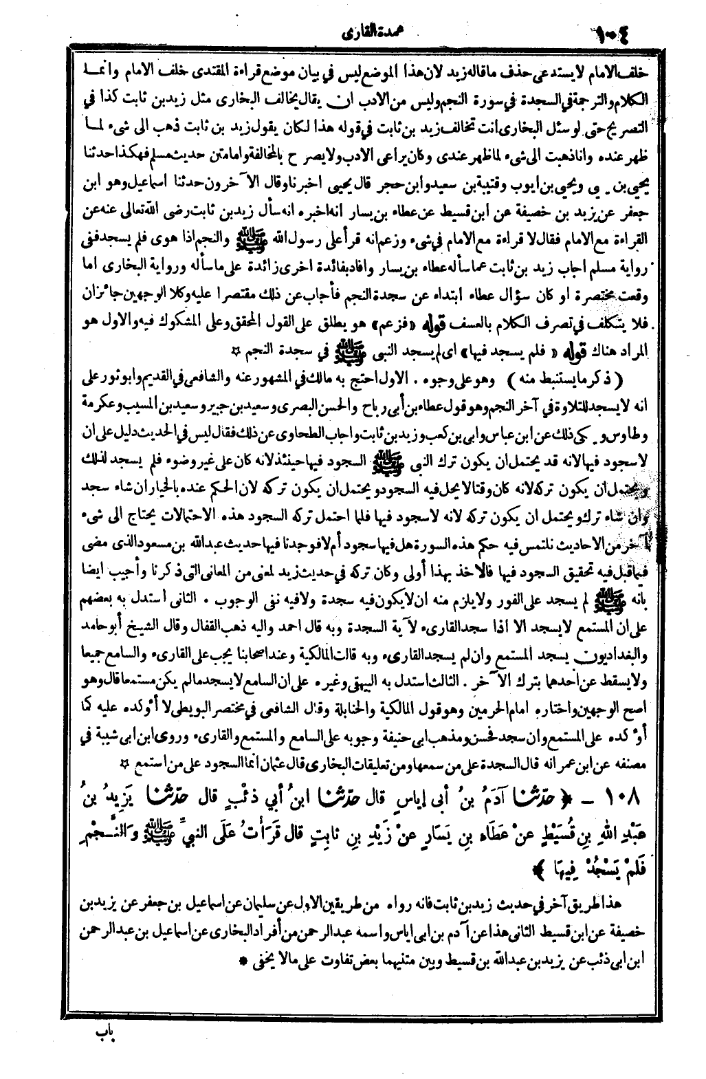 خلف الإِمَام لَا يَسْتَدْعِي حذف مَا قَالَه زيد، لِأَن هَذَا الْموضع لَيْسَ فِي بَيَان مَوضِع قِرَاءَة الْمُقْتَدِي خلف الإِمَام، وَإِنَّمَا الْكَلَام والترجمة فِي السَّجْدَة فِي سُورَة النَّجْم، وَلَيْسَ من الْأَدَب أَن يُقَال: يُخَالف البُخَارِيّ مثل زيد بن ثَابت، كَذَا فِي التَّصْرِيح حَتَّى لَو سُئِلَ البُخَارِيّ: أَنْت تخَالف زيد بن ثَابت فِي قَوْله هَذَا؟ لَكَانَ يَقُول: زيد بن ثَابت ذهب إِلَى شَيْء لما ظهر عِنْده، وَأَنا ذهبت إِلَى شَيْء لما ظهر عِنْدِي، وَكَانَ يُرَاعِي الْأَدَب وَلَا يُصَرح بالمخالفة، وَأما متن حَدِيث مُسلم فَهَكَذَا: حَدثنَا يحيى بن يحيى وَيحيى بن أَيُّوب وقتيبة بن سعيد وَابْن حجر، قَالَ يحيى: أخبرنَا، وَقَالَ الْآخرُونَ: حَدثنَا إِسْمَاعِيل، وَهُوَ ابْن جَعْفَر عَن يزِيد بن خصيفَة عَن ابْن قسيط عَن عَطاء بن يسَار أَنه أخبرهُ أَنه سَأَلَ زيد بن ثَابت، رَضِي الله تَعَالَى عَنهُ، عَن الْقِرَاءَة مَعَ الإِمَام، فَقَالَ: لَا قِرَاءَة مَعَ الإِمَام فِي شَيْء، وَزعم أَنه قَرَأَ على رَسُول الله صلى الله عَلَيْهِ وَسلم {والنجم إِذا هوى} فَلم يسْجد، فَفِي رِوَايَة مُسلم أجَاب زيد بن ثَابت عَمَّا سَأَلَهُ عَطاء بن يسَار، وَأفَاد بفائدة أُخْرَى زَائِدَة على مَا سَأَلَهُ، وَرِوَايَة البُخَارِيّ إِمَّا وَقعت مختصرة أَو كَانَ سُؤال عَطاء ابْتِدَاء عَن سَجْدَة النَّجْم، فَأجَاب عَن ذَلِك مُقْتَصرا عَلَيْهِ، وكلا الْوَجْهَيْنِ جائزان فَلَا يتَكَلَّف فِي تصرف الْكَلَام بالعسف. قَوْله: (فَزعم) ، هُوَ يُطلق على القَوْل الْمُحَقق وعَلى الْمَشْكُوك فِيهِ، وَالْأول هُوَ المُرَاد هُنَاكَ. قَوْله: (فَلم يسْجد فِيهَا) أَي: لم يسْجد النَّبِي صلى الله عَلَيْهِ وَسلم فِي سَجْدَة النَّجْم.