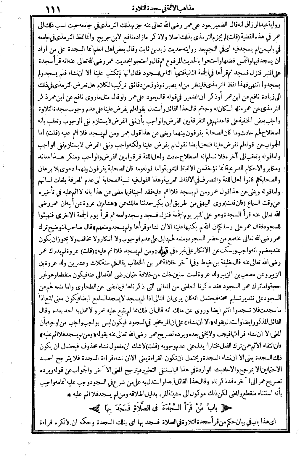 عبد الرَّزَّاق: أَنه قَالَ، الضَّمِير يعود على عمر، رَضِي الله تَعَالَى عَنهُ، جزم بذلك التِّرْمِذِيّ فِي (جَامعه) حَيْثُ نسب ذَلِك إِلَى عمر فِي هَذِه الْقَضِيَّة. قلت: لم يجْزم التِّرْمِذِيّ بذلك أصلا، وَلَا ذكر مَا زَاده نَافِع لِابْنِ جريج، وَإِنَّمَا لفظ التِّرْمِذِيّ فِي (جَامعه) فِي: بَاب من لم يسْجد فِيهِ، أَي: فِي النَّجْم، بعد رِوَايَته حَدِيث زيد بن ثَابت، وَقَالَ بعض أهل الْعلم: إِنَّمَا السَّجْدَة على من أَرَادَ أَن يسْجد فِيهَا وَالْتمس فَضلهَا، وَاحْتَجُّوا بِالْحَدِيثِ الْمَرْفُوع، ثمَّ قَالَ: وَاحْتَجُّوا بِحَدِيث عمر، رَضِي الله تَعَالَى عَنهُ، أَنه قَرَأَ سَجْدَة على الْمِنْبَر فَنزل فَسجدَ ثمَّ قَرَأَهَا فِي الْجُمُعَة الثَّانِيَة فتهيأ النَّاس للسُّجُود فَقَالَ: إِنَّهَا لم تكْتب علينا إلاّ أَن نشَاء، فَلم يسْجد وَلم يسجدوا، انْتهى. فَهَذَا لفظ التِّرْمِذِيّ، فَلْينْظر من لَهُ بَصِيرَة وذوق من دقائق تركيب الْكَلَام، هَل تعرض التِّرْمِذِيّ فِي ذَلِك إِلَى زِيَادَة نَافِع عَن ابْن عمر؟ أَو ذكر أَن الضَّمِير فِي قَوْله: قَالَ، يعود على عمر؟ وَلَو قَالَ: مثل مَا روى نَافِع عَن ابْن عمر ذكر التِّرْمِذِيّ عَن عمر مثله لَكَانَ لَهُ وَجه ثمَّ قَالَ هَذَا الْقَائِل: وَاسْتدلَّ بقوله: لم يفْرض علينا، على عدم وجوب سَجْدَة التِّلَاوَة. وَأجَاب بعض الْحَنَفِيَّة على قاعدتهم فِي التَّفْرِقَة بَين الْفَرْض وَالْوَاجِب بِأَن نفي الْفَرْض لَا يسْتَلْزم نفي الْوُجُوب، وَتعقب بِأَنَّهُ اصْطِلَاح لَهُم حَادث، وَمَا كَانَ الصَّحَابَة يفرقون بَينهمَا، ويغني عَن هَذَا قَول عمر: وَمن لم يسْجد فَلَا إِثْم عَلَيْهِ.