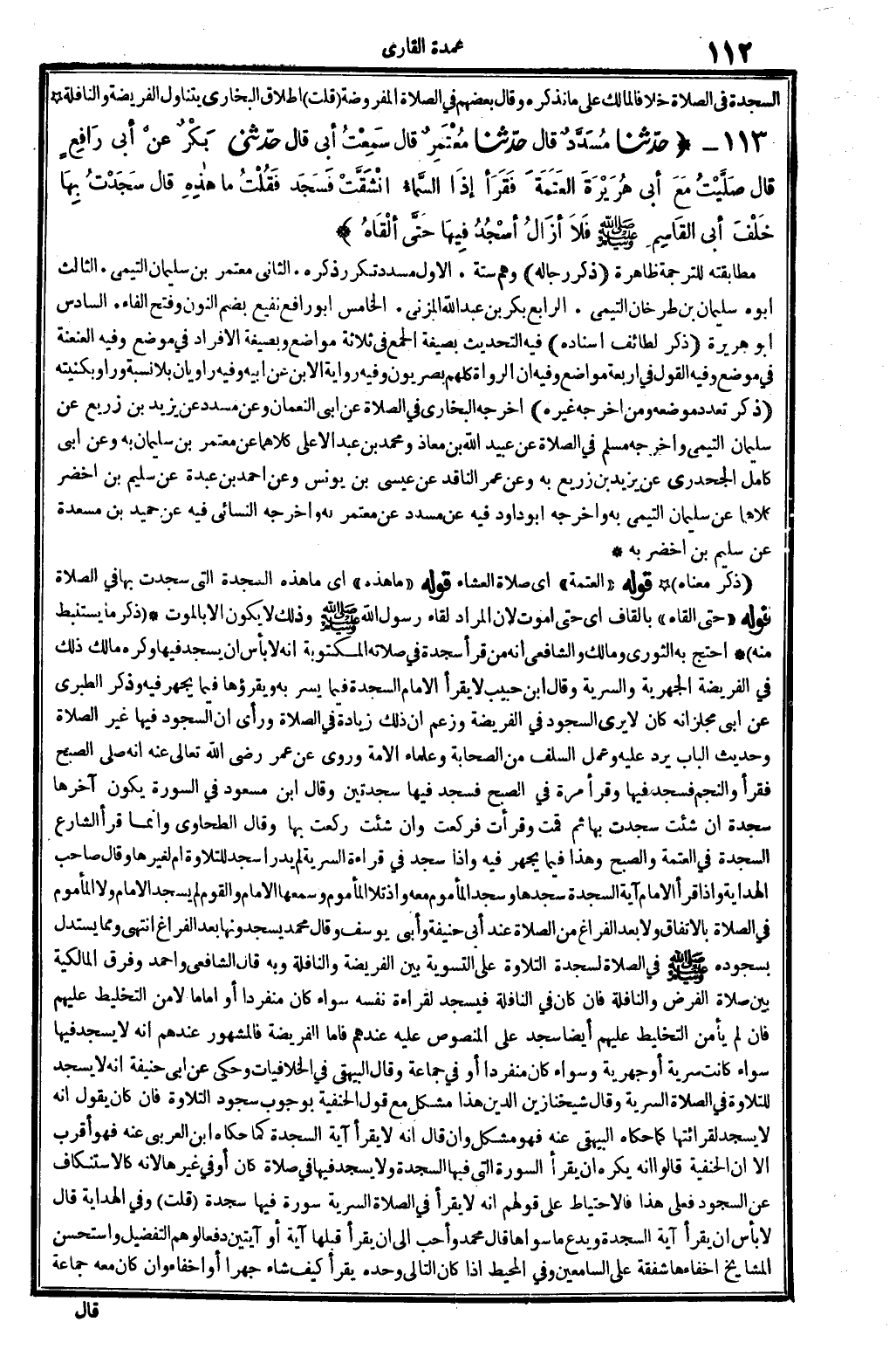 8701 - حدَّثنا مُسَدَّدٌ قَالَ حدَّثنا مُعْتَمِرٌ قَالَ سَمِعْتُ أبي قَالَ حدَّثني بَكْرٌ عنْ أبي رَافِعٍ قَالَ صلَّيْتُ مَعَ أبي هُرَيْرَةَ العَتَمَةَ فقَرَأَ إذَا السَّماءُ انْشَقَّتْ فَسَجَدَ قلْتُ مَا هاذِهِ قَالَ سَجَدْتُ بِهَا خَلْفَ أبي القَاسِمِ صلى الله عَلَيْهِ وَسلم فَلاَ أزَالُ أسْجُدُ فِيهَا حَتَّى ألْقَاهُ.