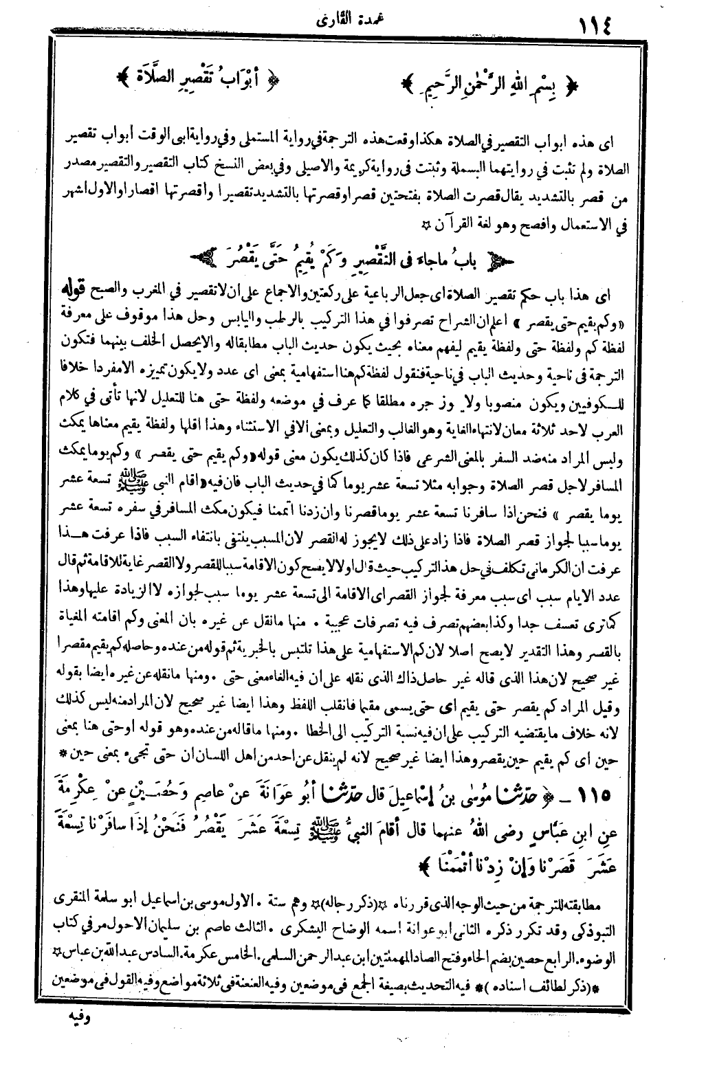 0801 - حدَّثنا مُوساى بنُ إسْمَاعِيلَ قَالَ حدَّثنا أبُو عَوَانَةَ عنْ عَاصِم وَحُصَيْنٍ عنْ عِكْرَمَةَ عنِ ابنِ عَبَّاسٍ رَضِي الله تَعَالَى عَنْهُمَا قَالَ أقامَ النبيُّ صلى الله عَلَيْهِ وَسلم تِسْعَةَ عَشَرَ يَقْصُرُ فَنَحْنُ إذَا سَافَرْنَا تِسْعَةَ عَشَرَ قَصَرْنَا وَإنْ زِدْنَا أتْمَمْنَا.