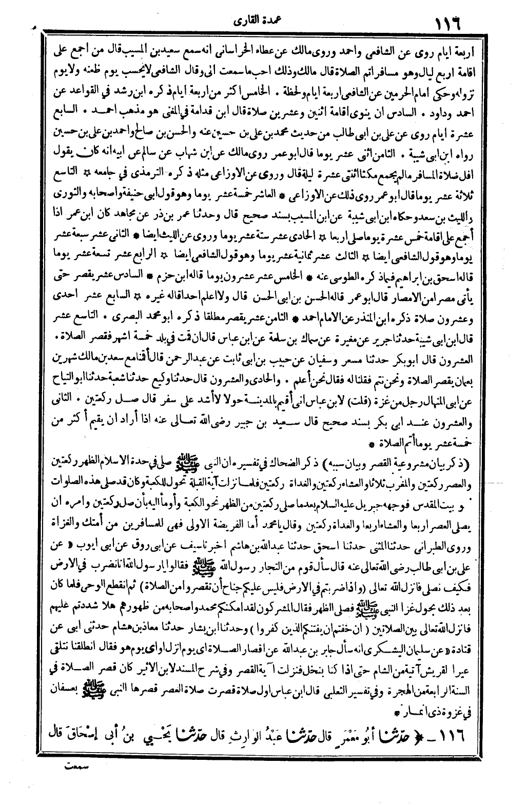 أَرْبَعَة أَيَّام، رُوِيَ عَن الشَّافِعِي وَأحمد، وروى مَالك عَن عَطاء الْخُرَاسَانِي أَنه سمع سعيد بن الْمسيب قَالَ: من أجمع على إِقَامَة أَربع لَيَال وَهُوَ مُسَافر أتم الصَّلَاة، قَالَ مَالك: وَذَلِكَ أحب مَا سَمِعت إِلَيّ. وَقَالَ الشَّافِعِي: لَا يحْسب يَوْم ظعنه وَلَا يَوْم نُزُوله. وَحكى إِمَام الْحَرَمَيْنِ عَن الشَّافِعِي: أَرْبَعَة أَيَّام ولحظة. الْخَامِس: أَكثر من أَرْبَعَة أَيَّام، ذكره ابْن رشد فِي الْقَوَاعِد عَن أَحْمد وَدَاوُد. السَّادِس: أَن يَنْوِي إِقَامَة اثْنَيْنِ وَعشْرين صَلَاة، قَالَ ابْن قدامَة فِي (الْمُغنِي) : هُوَ مَذْهَب أَحْمد. السَّابِع: عشرَة أَيَّام، رُوِيَ عَن عَليّ بن أبي طَالب: من حَدِيث مُحَمَّد بن عَليّ بن حُسَيْن عَنهُ، وَالْحسن بن صَالح وَأحمد بن عَليّ بن حُسَيْن، رَوَاهُ ابْن أبي شيبَة. الثَّامِن: اثْنَي عشر يَوْمًا، قَالَ أَبُو عمر: روى مَالك عَن ابْن شهَاب عَن سَالم عَن أَبِيه أَنه كَانَ يَقُول: أفل، صَلَاة الْمُسَافِر، مَا لم يجمع مكثا إثنتي عشرَة لَيْلَة، قَالَ: وروى عَن الْأَوْزَاعِيّ مثله، ذكره التِّرْمِذِيّ فِي (جَامعه) . التَّاسِع: ثَلَاثَة عشر يَوْمًا. قَالَ أَبُو عمر: رُوِيَ ذَلِك عَن الْأَوْزَاعِيّ. الْعَاشِر: خَمْسَة عشر يَوْمًا، وَهُوَ قَول أبي حنيفَة وَأَصْحَابه، وَالثَّوْري وَاللَّيْث بن سعد، وَحَكَاهُ ابْن أبي شيبَة عَن ابْن الْمسيب بِسَنَد صَحِيح، قَالَ: وَحدثنَا عمر بن ذَر عَن مُجَاهِد: كَانَ ابْن عمر إِذا أجمع على إِقَامَة خمس عشرَة يَوْمًا صلى أَرْبعا. الْحَادِي عشر: سِتَّة عشر يَوْمًا، وَرُوِيَ عَن اللَّيْث أَيْضا. الثَّانِي عشر: سَبْعَة عشر يَوْمًا، وَهُوَ قَول الشَّافِعِي أَيْضا. الثَّالِث عشر: ثَمَانِيَة عشر يَوْمًا، وَهُوَ قَول الشَّافِعِي أَيْضا. الرَّابِع عشر: تِسْعَة عشر يَوْمًا، قَالَه إِسْحَاق بن إِبْرَاهِيم، فِيمَا ذكره الطوسي عَنهُ. الْخَامِس عشر: عشرُون يَوْمًا، قَالَه ابْن حزم. السَّادِس عشر: يقصر حَتَّى يَأْتِي مصرا من الْأَمْصَار، قَالَ أَبُو عمر: قَالَه الْحسن بن أبي الْحسن: قَالَ: وَلَا أعلم أحدا قَالَه غَيره. السَّابِع عشر: إِحْدَى وَعِشْرُونَ صَلَاة، ذكره ابْن الْمُنْذر عَن الإِمَام أَحْمد. الثَّامِن عشر: يقصر مُطلقًا، ذكره أَبُو مُحَمَّد الْبَصْرِيّ. التَّاسِع عشر: قَالَ ابْن أبي شيبَة: حَدثنَا جرير عَن مُغيرَة عَن سماك بن سَلمَة عَن ابْن عَبَّاس، قَالَ: إِن قُمْت فِي بلد خَمْسَة أشهر فقصر الصَّلَاة. الْعشْرُونَ: قَالَ أَبُو بكر: حَدثنَا مسعر وسُفْيَان عَن حبيب بن أبي ثَابت عَن عبد الرَّحْمَن قَالَ: أَقَمْنَا مَعَ سعد بن مَالك شَهْرَيْن بعمان يقصر الصَّلَاة، وَنحن نتم، فَقُلْنَا لَهُ، فَقَالَ نَحن أعلم. وَالْحَادِي وَالْعشْرُونَ، قَالَ: حَدثنَا وَكِيع حَدثنَا شُعْبَة حَدثنَا أَبُو التياح عَن أبي الْمنْهَال، رجل من غَزَّة. قلت لِابْنِ عَبَّاس: إِنِّي أقيم بِالْمَدِينَةِ حولا لَا أَشد على سفر. قَالَ: صلِّ رَكْعَتَيْنِ. الثَّانِي وَالْعشْرُونَ: عِنْد أبي بكر بِسَنَد صَحِيح قَالَ سعيد بن جُبَير، رَضِي الله تَعَالَى عَنهُ: إِذا أَرَادَ أَن يُقيم أَكثر من خَمْسَة عشر يَوْمًا أتم الصَّلَاة.