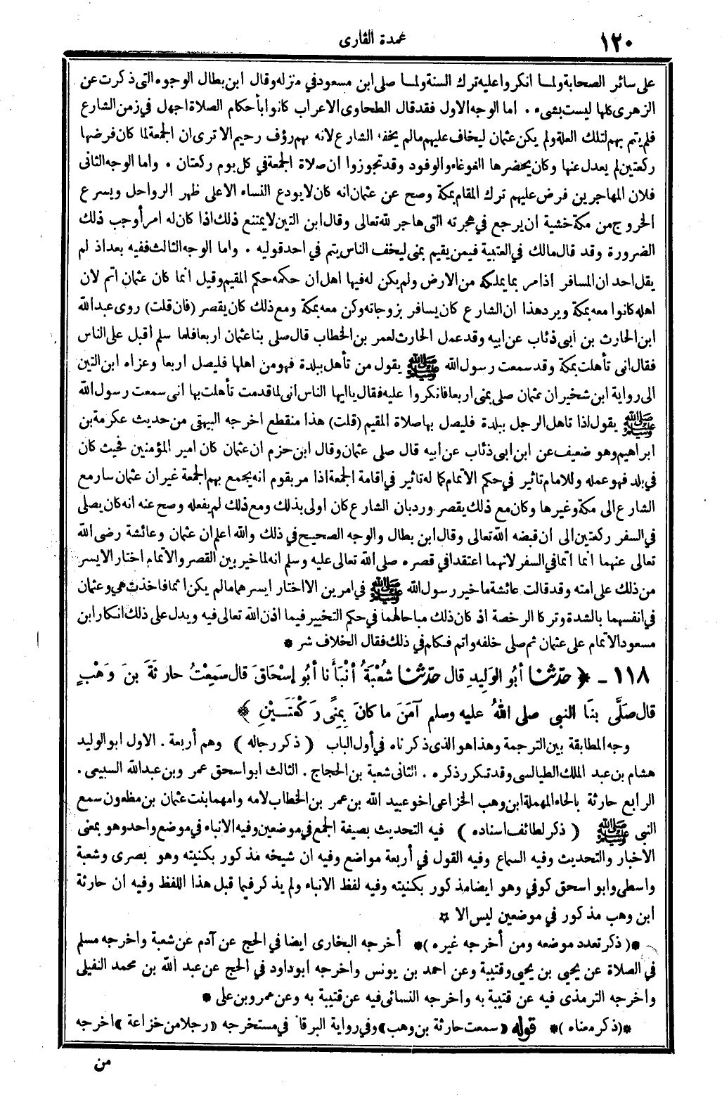 على سَائِر الصَّحَابَة وَلما أَنْكَرُوا عَلَيْهِ ترك السّنة، وَلما صلى ابْن مَسْعُود فِي منزله، وَقَالَ ابْن بطال: الْوُجُوه الَّتِي ذكرت عَن الزُّهْرِيّ كلهَا لَيست بِشَيْء. أما الْوَجْه الأول فقد قَالَ الطَّحَاوِيّ: الْأَعْرَاب كَانُوا بِأَحْكَام الصَّلَاة أَجْهَل فِي زمن الشَّارِع فَلم يتم بهم لتِلْك الْعلَّة، وَلم يكن عُثْمَان ليخاف عَلَيْهِم مَا لم يخفه الشَّارِع، لِأَنَّهُ بهم رؤوف رَحِيم، أَلا ترى أَن الْجُمُعَة لما كَانَ فَرضهَا رَكْعَتَيْنِ لم يعدل عَنْهَا، وَكَانَ يحضرها الغوغاء والوفود، وَقد تجوزوا أَن صَلَاة الْجُمُعَة فِي كل يَوْم رَكْعَتَانِ؟ وَأما الْوَجْه الثَّانِي: فَلِأَن الْمُهَاجِرين فرض عَلَيْهِم ترك الْمقَام بِمَكَّة، وَصَحَّ عَن عُثْمَان أَنه كَانَ لَا يودع النِّسَاء إلاّ على ظهر الرَّوَاحِل، ويسرع الْخُرُوج من مَكَّة خشيَة أَن يرجع فِي هجرته الَّتِي هَاجر لله تَعَالَى، وَقَالَ ابْن التِّين: لَا يمْتَنع ذَلِك إِذا كَانَ لَهُ أَمر أوجب ذَلِك الضَّرُورَة، وَقد قَالَ مَالك فِي (الْعُتْبِيَّة) فِيمَن يُقيم بمنى ليخف النَّاس: يتم، فِي أحد قوليه. وَأما الْوَجْه الثَّالِث فَفِيهِ بُعد، إِذْ لم يقل أحد إِن الْمُسَافِر إِذا مر بِمَا يملكهُ من الأَرْض وَلم يكن لَهُ فِيهَا أهل أَن حكمه حكم الْمُقِيم، وَقيل: إِنَّمَا كَانَ عُثْمَان أتم لِأَن أَهله كَانُوا مَعَه بِمَكَّة، وَيرد هَذَا أَن الشَّارِع كَانَ يُسَافر بزوجاته وَكن مَعَه بِمَكَّة، وَمَعَ ذَلِك كَانَ يقصر. فَإِن قلت: روى عبد الله ابْن الْحَارِث بن أبي ذئاب عَن أَبِيه، وَقد عمل الْحَارِث لعمر بن الْخطاب، قَالَ: صلى بِنَا عُثْمَان أَرْبعا، فَلَمَّا سلم أقبل على النَّاس فَقَالَ: إِنِّي تأهلت بِمَكَّة، وَقد سَمِعت رَسُول الله صلى الله عَلَيْهِ وَسلم يَقُول: من تأهل ببلدة فَهُوَ من أَهلهَا، فَليصل أَرْبعا، وَعَزاهُ ابْن التِّين إِلَى رِوَايَة ابْن شخير: أَن عُثْمَان صلى بمنى أَرْبعا، فأنكروا عَلَيْهِ، فَقَالَ: يَا أَيهَا النَّاس، إِنِّي لما قدمت تأهلت بهَا، إِنِّي سَمِعت رَسُول الله صلى الله عَلَيْهِ وَسلم يَقُول: إِذا تأهل الرجل ببلدة فَليصل بهَا صَلَاة الْمُقِيم. قلت: هَذَا مُنْقَطع أخرجه الْبَيْهَقِيّ من حَدِيث عِكْرِمَة بن إِبْرَاهِيم وَهُوَ ضَعِيف عَن ابْن أبي ذئاب عَن أَبِيه قَالَ: صلى عُثْمَان، وَقَالَ ابْن حزم: إِن عُثْمَان كَانَ أَمِير الْمُؤمنِينَ، فَحَيْثُ كَانَ فِي بلد فَهُوَ عمله، وَللْإِمَام تَأْثِير فِي حكم الْإِتْمَام كَمَا لَهُ تَأْثِير فِي إِقَامَة الْجُمُعَة إِذا مر بِقوم أَنه يجمع بهم الْجُمُعَة، غير أَن عُثْمَان سَار مَعَ الشَّارِع إِلَى مَكَّة وَغَيرهَا، وَكَانَ مَعَ ذَلِك يقصر، ورد بِأَن الشَّارِع كَانَ أولى بذلك، وَمَعَ ذَلِك لم يَفْعَله، وَصَحَّ عَنهُ أَنه كَانَ يُصَلِّي فِي السّفر رَكْعَتَيْنِ إِلَى أَن قَبضه الله تَعَالَى. وَقَالَ ابْن بطال: وَالْوَجْه الصَّحِيح فِي ذَلِك، وَالله أعلم، أَن عُثْمَان وَعَائِشَة، رَضِي الله تَعَالَى عَنْهُمَا، إِنَّمَا أتما فِي السّفر لِأَنَّهُمَا اعتقدا فِي قصره، صلى الله عَلَيْهِ وَسلم، أَنه لما خير بَين الْقصر والإتمام اخْتَار الْأَيْسَر من ذَلِك على أمته، وَقد قَالَت عَائِشَة: مَا خير رَسُول الله صلى الله عَلَيْهِ وَسلم فِي أَمريْن إلاّ اخْتَار إيسرهما مَا لم يكن إِثْمًا، فَأخذت هِيَ وَعُثْمَان فِي أَنفسهمَا بالشدة وتركا الرُّخْصَة، إِذْ كَانَ ذَلِك مُبَاحا لَهما فِي حكم التَّخْيِير فِيمَا أذن الله تَعَالَى فِيهِ، وَيدل على ذَلِك إِنْكَار ابْن مَسْعُود الْإِتْمَام على عُثْمَان، ثمَّ صلى خَلفه وَأتم، فكُلم فِي ذَلِك فَقَالَ: الْخلاف شَرّ. [/ شَرّ