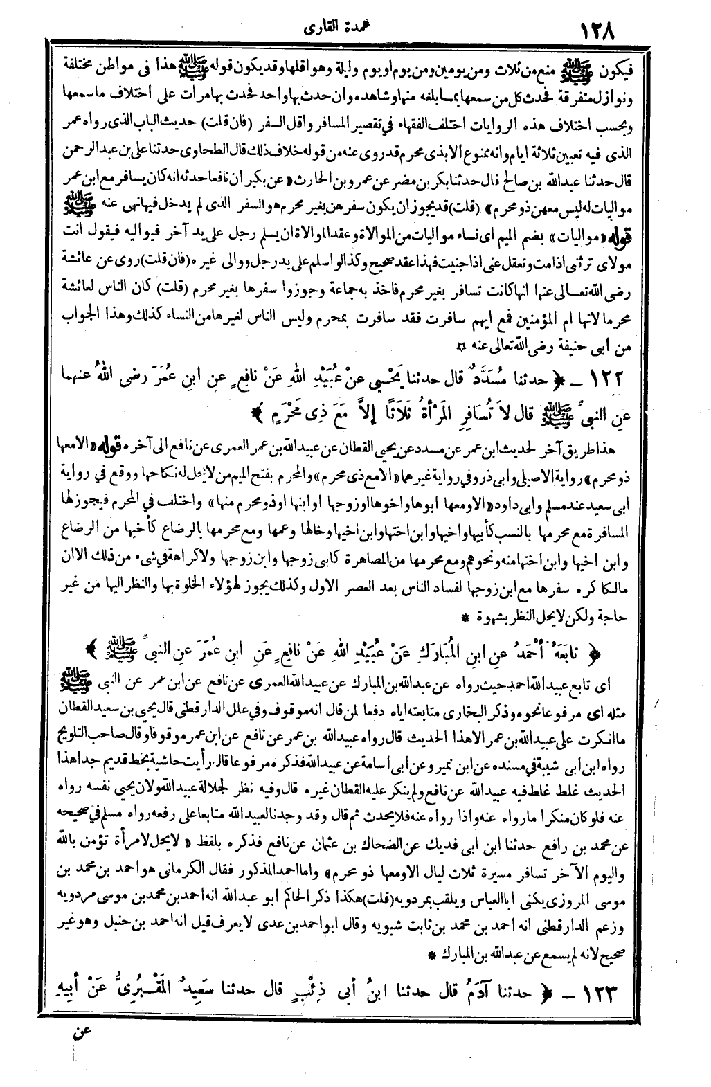 7801 - حدَّثنا مُسَدَّدٌ قَالَ حدَّثنا يَحْيَى عنْ عُبَيْدِ الله عنْ نافِعٍ عنِ ابنِ عُمَرَ رَضِي الله تَعَالَى عَنْهُمَا عنِ النبيِّ صلى الله عَلَيْهِ وَسلم قَالَ لاَ تُسَافِرُ المَرْأةُ إلاّ معَ ذِي مَحْرَمٍ.