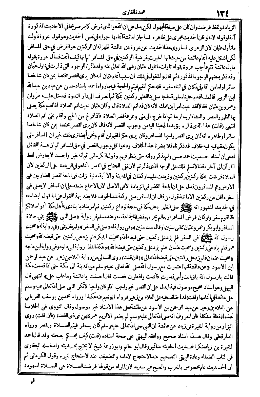 فَإِن قلت: روى النَّسَائِيّ من رِوَايَة الْعَلَاء بن زُهَيْر عَن عبد الرَّحْمَن ابْن الْأسود (عَن عَائِشَة أَنَّهَا، اعْتَمَرت مَعَ رَسُول الله، صلى الله عَلَيْهِ وَسلم، من الْمَدِينَة إِلَى مَكَّة حَتَّى إِذا قدمت مَكَّة قَالَت: يَا رَسُول الله بِأبي أَنْت وَأمي: قصرت فأتممت، وَأَفْطَرت فَصمت، قَالَ: أَحْسَنت يَا عَائِشَة، وَمَا عَابَ عَليّ) . انْتهى. قَالَ الْبَيْهَقِيّ: وَهُوَ إِسْنَاد صَحِيح مَوْصُول، فَهَذَا يدل على أَن الْقصر غير وَاجِب، إِذْ لَو كَانَ وَاجِبا لأنكر النَّبِي، صلى الله عَلَيْهِ وَسلم، على عَائِشَة فِي إِتْمَامهَا. قلت: قد اخْتلف فِيهِ على الْعَلَاء بن زُهَيْر، فَرَوَاهُ أَبُو نعيم عَنهُ هَكَذَا، وَرَوَاهُ مُحَمَّد بن يُوسُف الْفرْيَابِيّ عَن الْعَلَاء بن زُهَيْر عَن عبد الرَّحْمَن بن الْأسود عَن عَائِشَة، فعلى هَذَا الْإِسْنَاد غير مَوْصُول. وَقَالَ النَّوَوِيّ فِي (الْخُلَاصَة) : هَذِه اللَّفْظَة مشكلة، فَإِن الْمَعْرُوف أَنه، صلى الله عَلَيْهِ وَسلم، لم يعْتَمر إلاّ أَربع عمر، كُلهنَّ فِي ذِي الْقعدَة. فَإِن قلت: روى الْبَزَّار من رِوَايَة الْمُغيرَة بن زِيَاد عَن عَائِشَة أَن النَّبِي، صلى الله عَلَيْهِ وَسلم، كَانَ يُسَافر فَيتم الصَّلَاة وَيقصر، وَرَوَاهُ الدَّارَقُطْنِيّ، وَقَالَ: هَذَا إِسْنَاد صَحِيح، وَوَافَقَهُ الْبَيْهَقِيّ على صِحَة إِسْنَاده. قلت: كَيفَ يحكم بِصِحَّتِهِ وَقد قَالَ أَحْمد: الْمُغيرَة بن زِيَاد مُنكر الحَدِيث أَحَادِيثه مَنَاكِير؟ وَقَالَ أَبُو حَاتِم وَأَبُو زرْعَة: شيخ لَا يحْتَج بحَديثه؟ وَأدْخلهُ البُخَارِيّ فِي كتاب الضُّعَفَاء، وَعَادَة الْبَيْهَقِيّ التَّصْحِيح عِنْد الِاحْتِجَاج لإمامه والتضعيف عِنْد الِاحْتِجَاج لغيره.